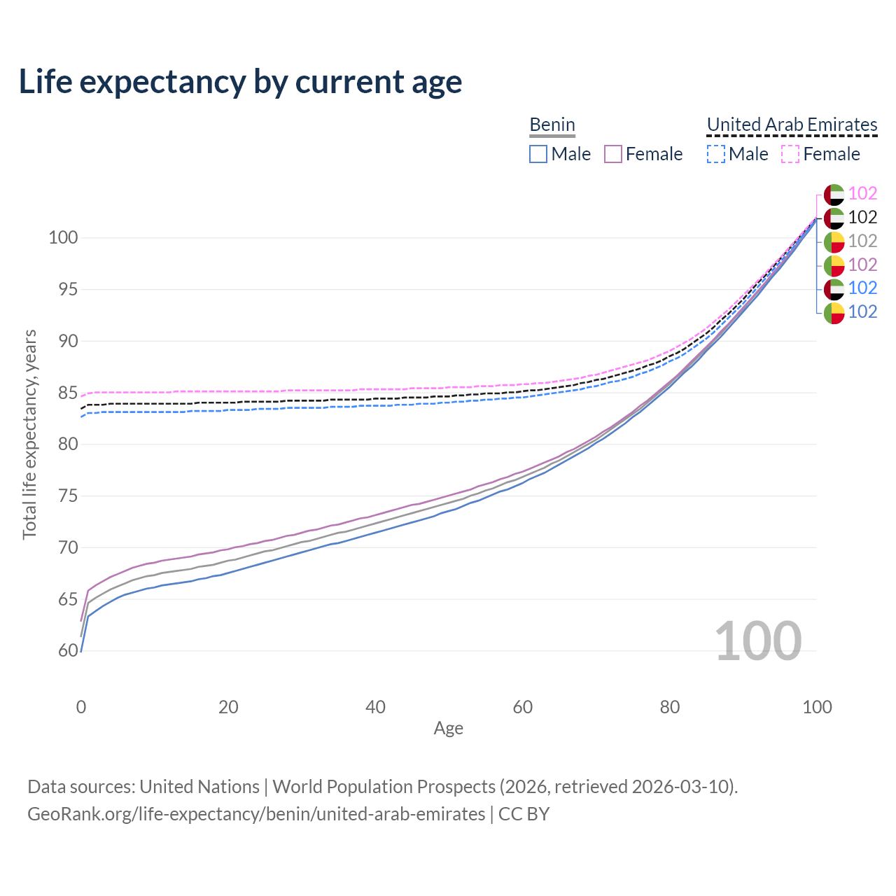 This life expectancy calculator shows the odds of living to 100, 95, 90, and below based on current age for both males and females in Benin and the United Arab Emirates, along with mean and median age of death. The calculations are based on the 2026 life tables (actuarial tables) from the UN World Population Prospects.