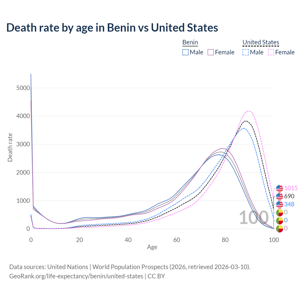 In Benin, the most common age of death is 0, compared to 89 in the United States. The median age of death is 70.1 in Benin and 83.9 in the United States, meaning only half of each cohort is expected to live past that age.