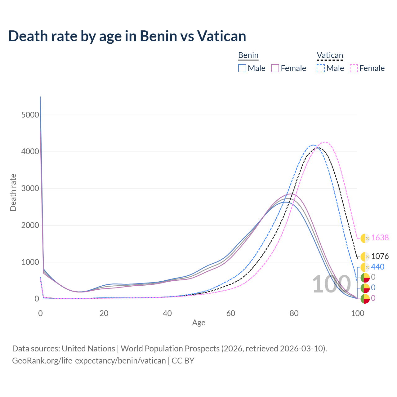 In Benin, the most common age of death is 0, compared to 88 in the Vatican. The median age of death is 70.1 in Benin and 85.7 in the Vatican, meaning only half of each cohort is expected to live past that age.