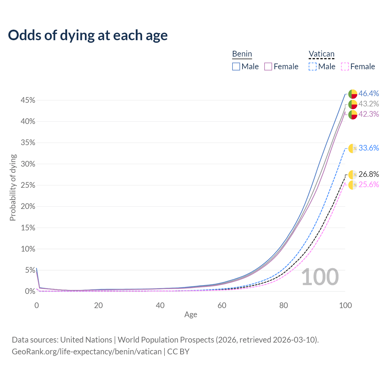 This life expectancy calculator shows the odds of living to 100, 95, 90, and below based on current age for both males and females in Benin and the Vatican, along with mean and median age of death. The calculations are based on the 2026 life tables (actuarial tables) from the UN World Population Prospects.