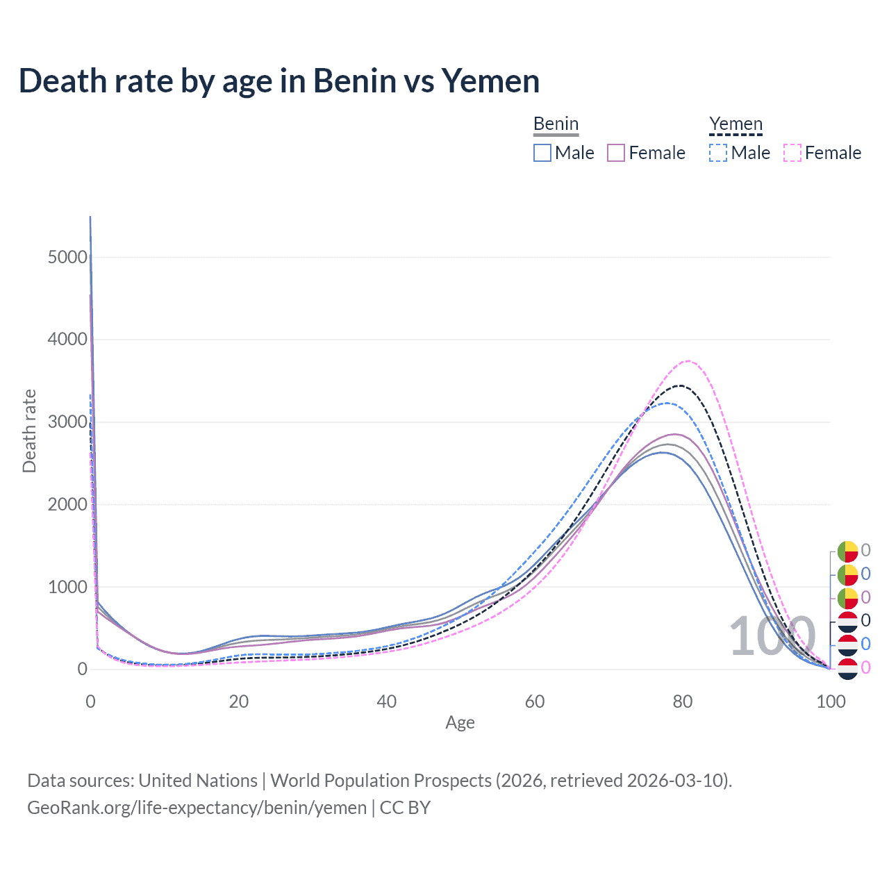In Benin, the most common age of death is 0, compared to 80 in Yemen. The median age of death is 70.1 in Benin and 74.9 in Yemen, meaning only half of each cohort is expected to live past that age.