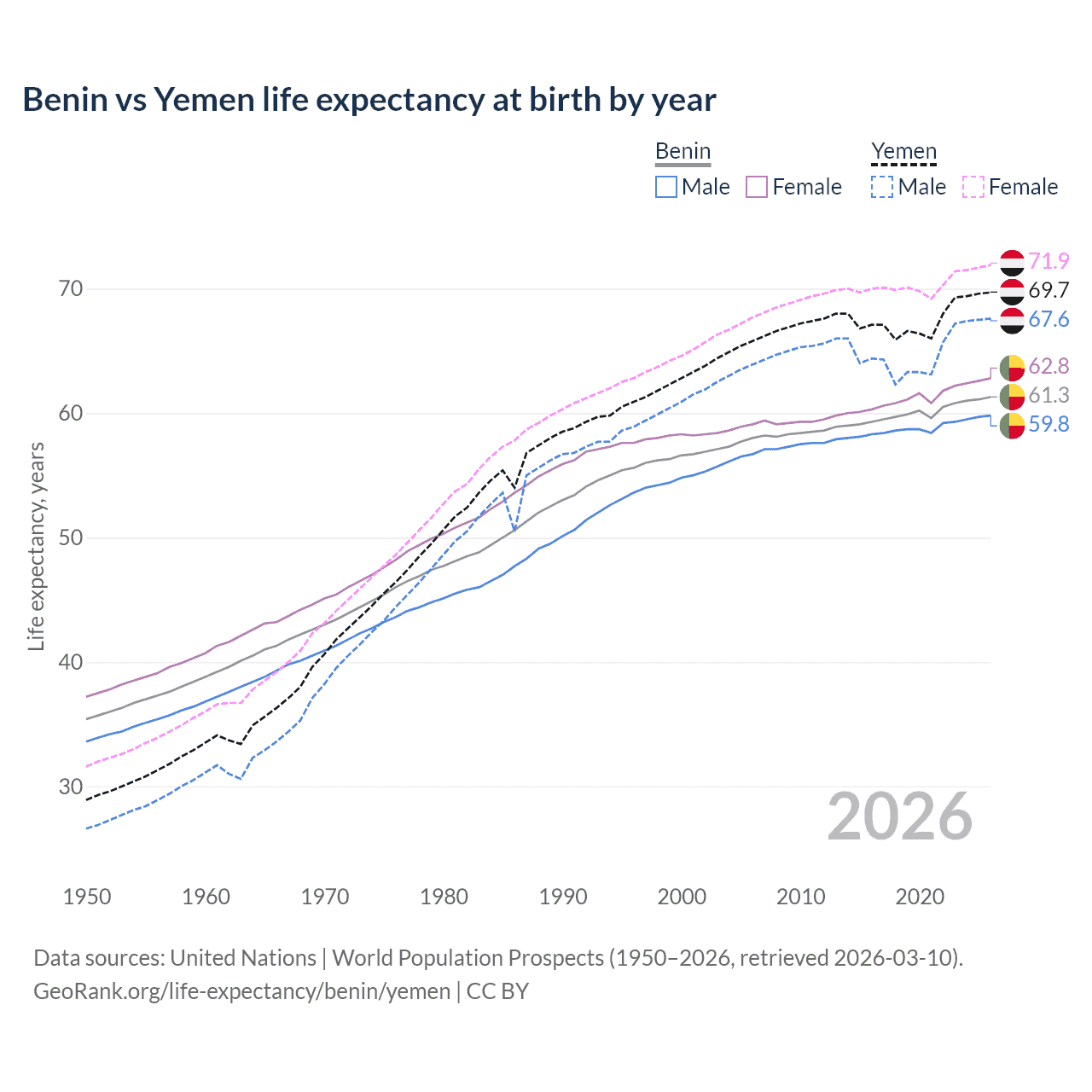 The average life expectancy at birth is 61.3 years in Benin vs 69.7 in Yemen. Benin is ranked 189/197 by life expectancy, and Yemen is 138/197. In Benin, the life expectancy is 59.8 years for males and 62.8 years for females. In Yemen, it's 67.6 years for males and 71.9 years for females.
