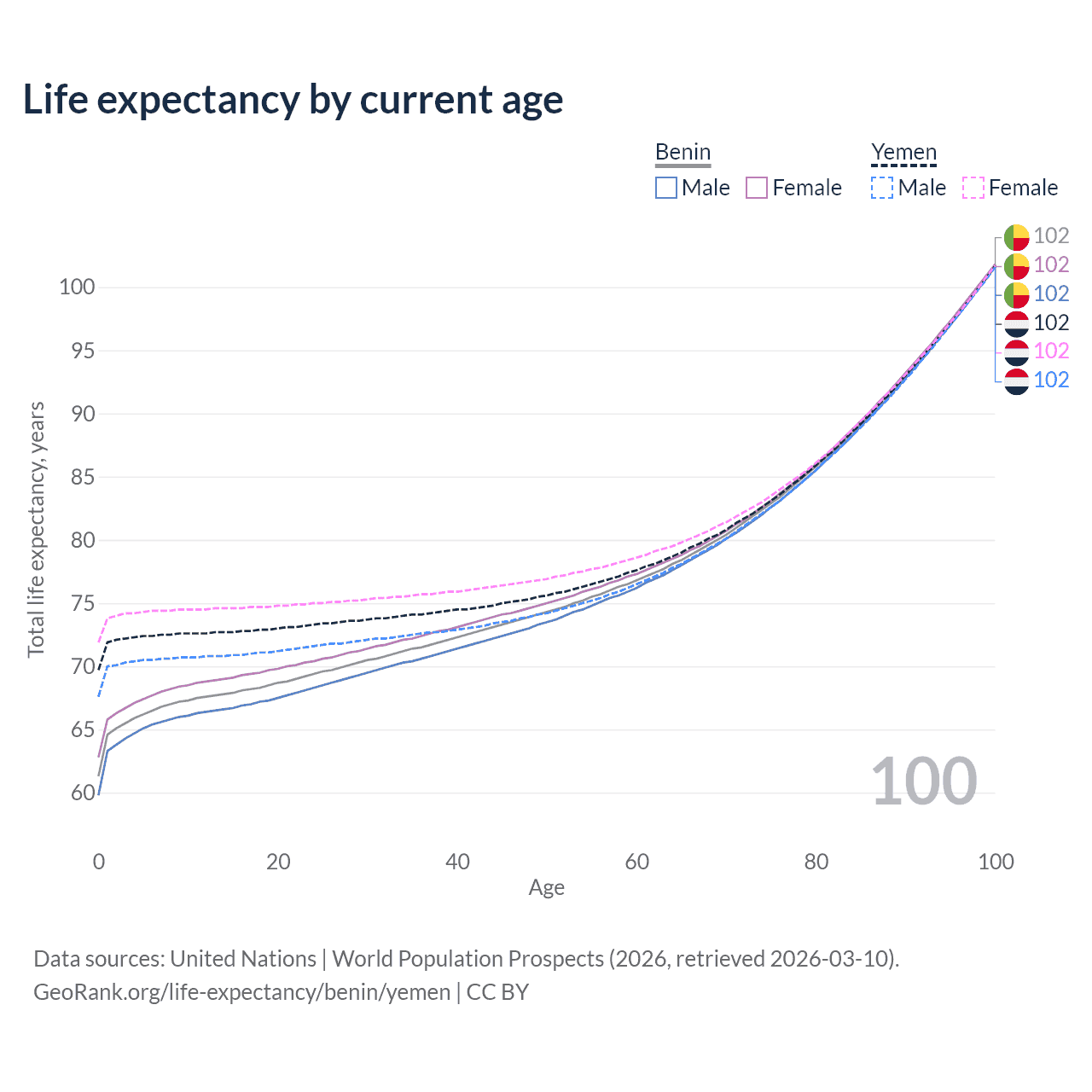 This life expectancy calculator shows the odds of living to 100, 95, 90, and below based on current age for both males and females in Benin and Yemen, along with mean and median age of death. The calculations are based on the 2026 life tables (actuarial tables) from the UN World Population Prospects.