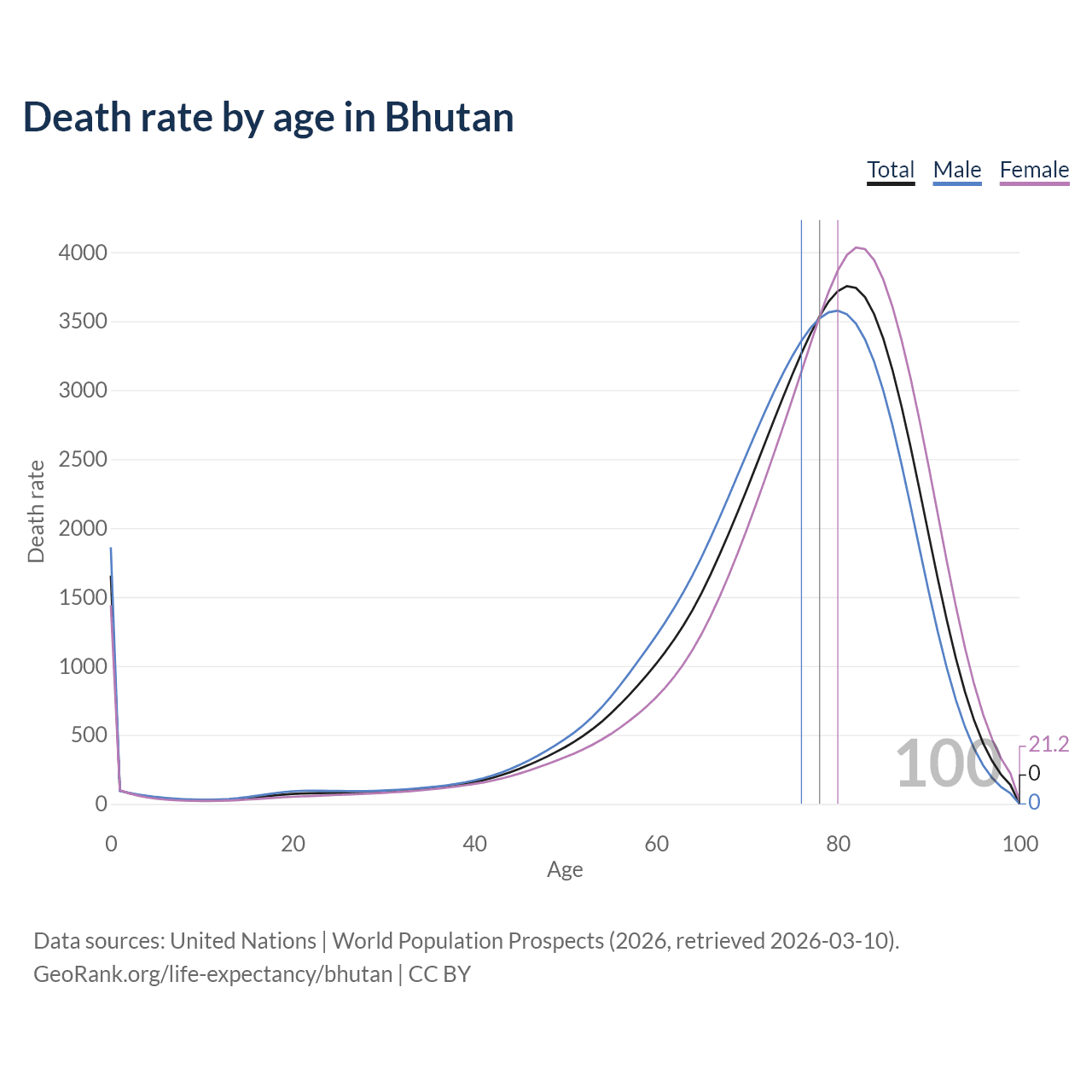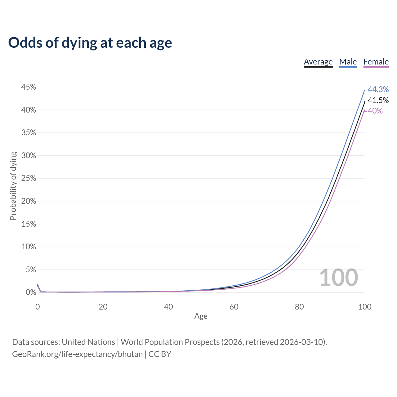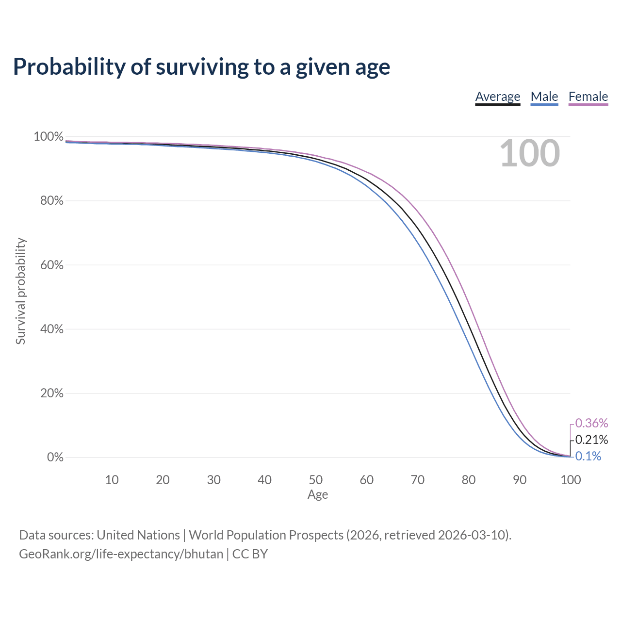 This life expectancy calculator shows the odds of living to 100, 95, 90, and below based on current age for both males and females in Bhutan, along with mean and median age of death. The calculations are based on the 2026 life tables (actuarial tables) from the UN World Population Prospects.