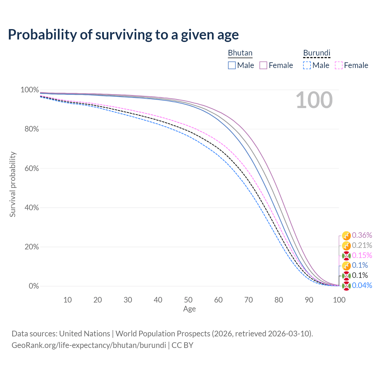 This life expectancy calculator shows the odds of living to 100, 95, 90, and below based on current age for both males and females in Bhutan and Burundi, along with mean and median age of death. The calculations are based on the 2026 life tables (actuarial tables) from the UN World Population Prospects.