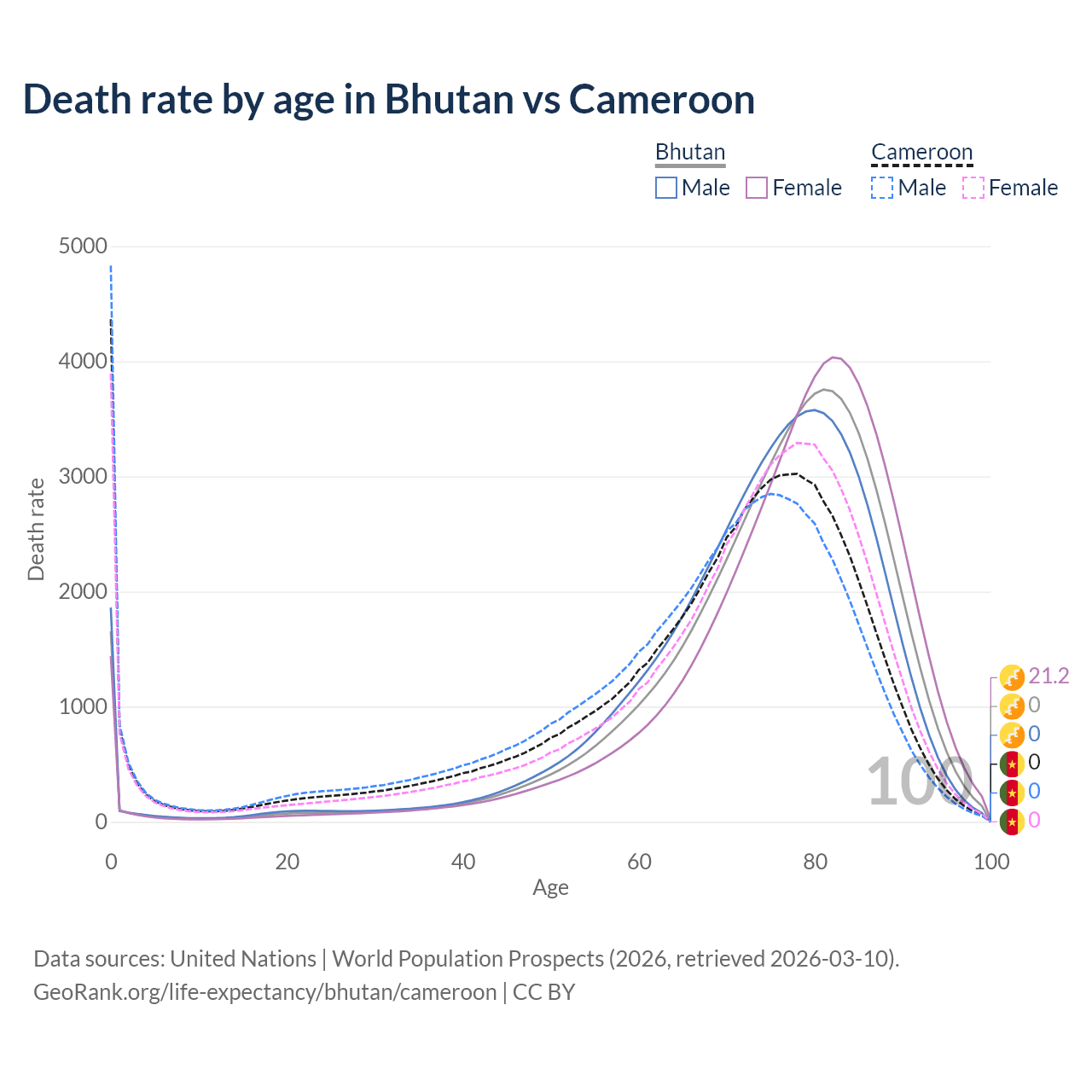 This life expectancy calculator shows the odds of living to 100, 95, 90, and below based on current age for both males and females in Bhutan and Cameroon, along with mean and median age of death. The calculations are based on the 2026 life tables (actuarial tables) from the UN World Population Prospects.