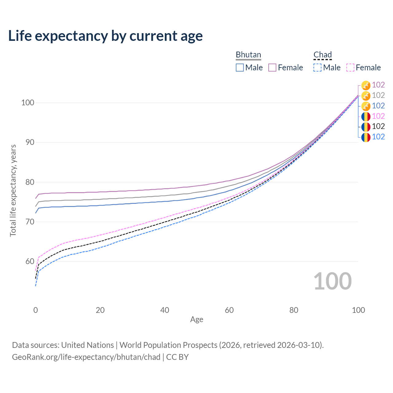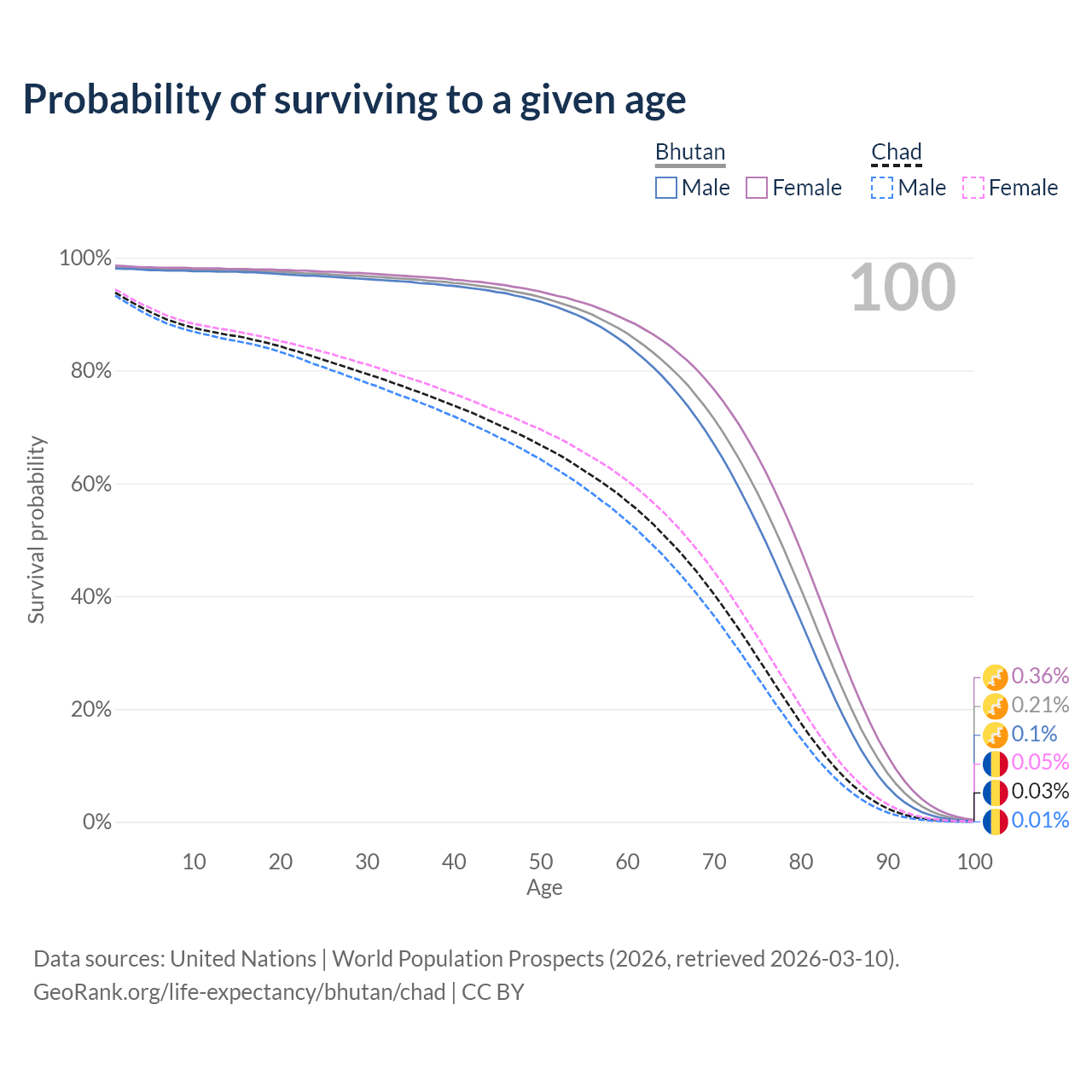 This life expectancy calculator shows the odds of living to 100, 95, 90, and below based on current age for both males and females in Bhutan and Chad, along with mean and median age of death. The calculations are based on the 2026 life tables (actuarial tables) from the UN World Population Prospects.