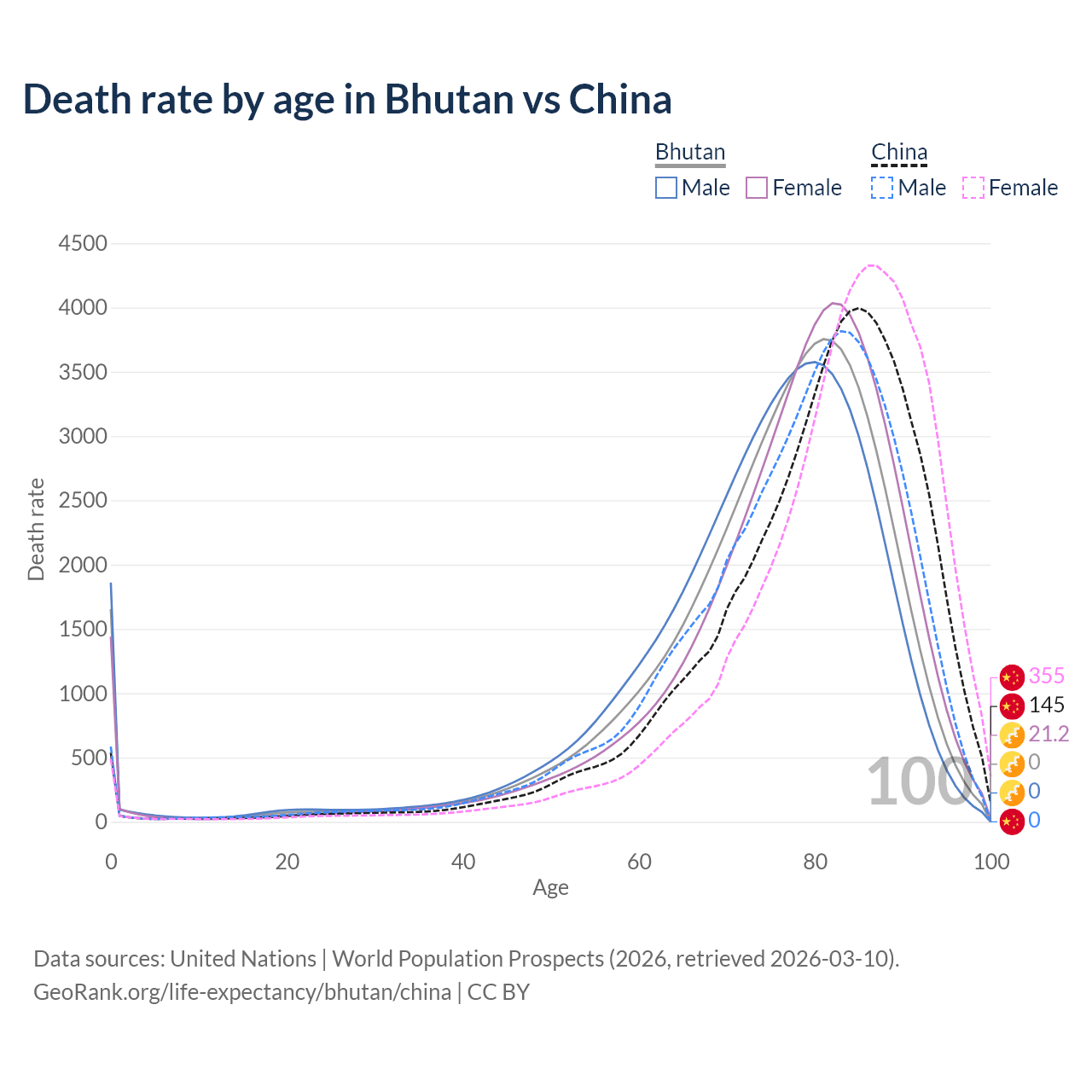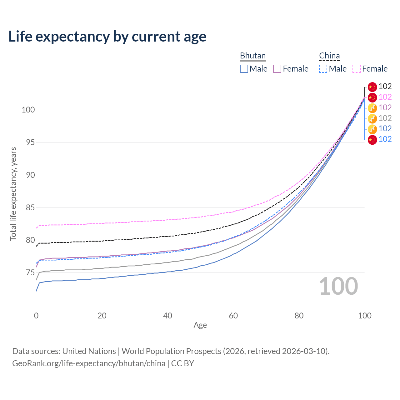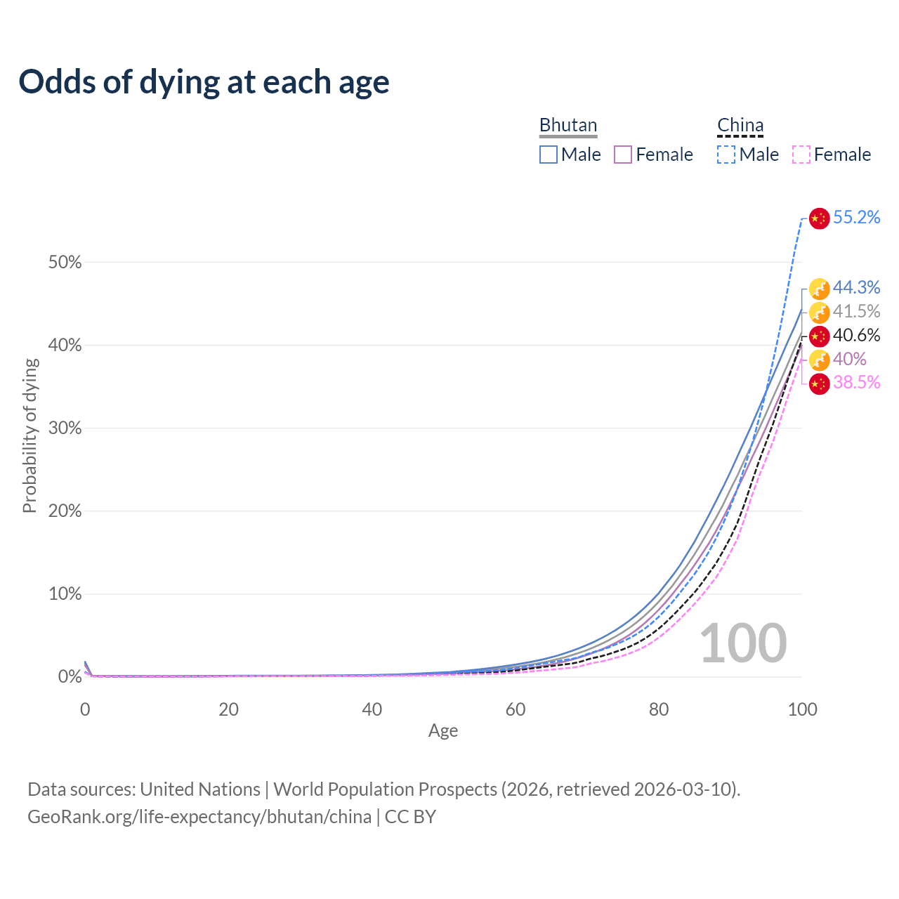 This life expectancy calculator shows the odds of living to 100, 95, 90, and below based on current age for both males and females in Bhutan and China, along with mean and median age of death. The calculations are based on the 2026 life tables (actuarial tables) from the UN World Population Prospects.
