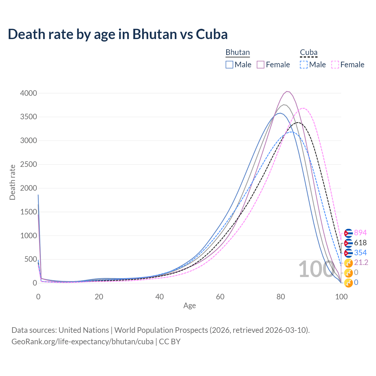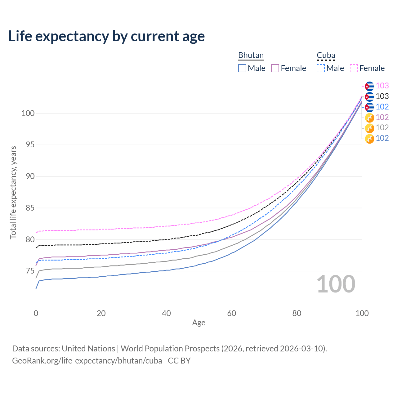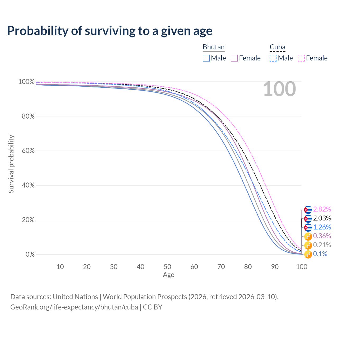 This life expectancy calculator shows the odds of living to 100, 95, 90, and below based on current age for both males and females in Bhutan and Cuba, along with mean and median age of death. The calculations are based on the 2026 life tables (actuarial tables) from the UN World Population Prospects.