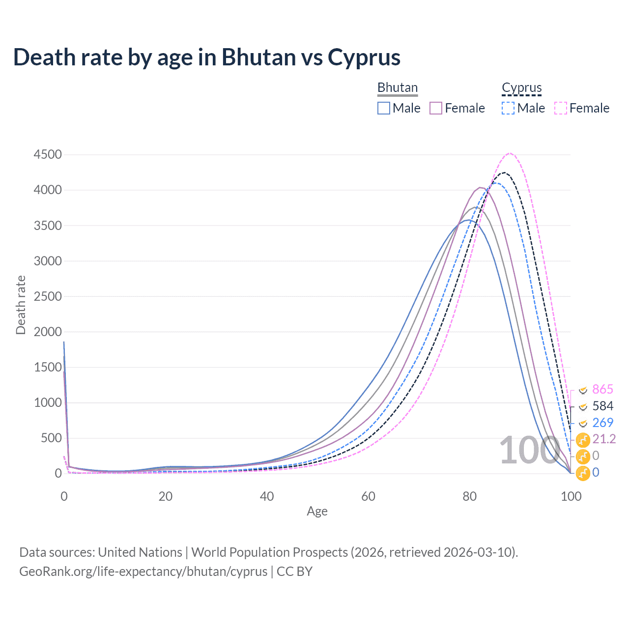 In Bhutan, the most common age of death is 81, compared to 87 in Cyprus. The median age of death is 77.6 in Bhutan and 84.3 in Cyprus, meaning only half of each cohort is expected to live past that age.