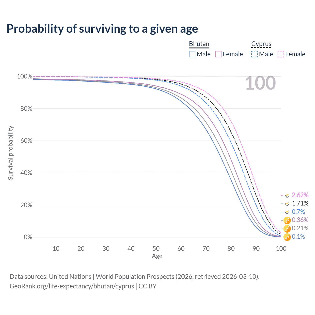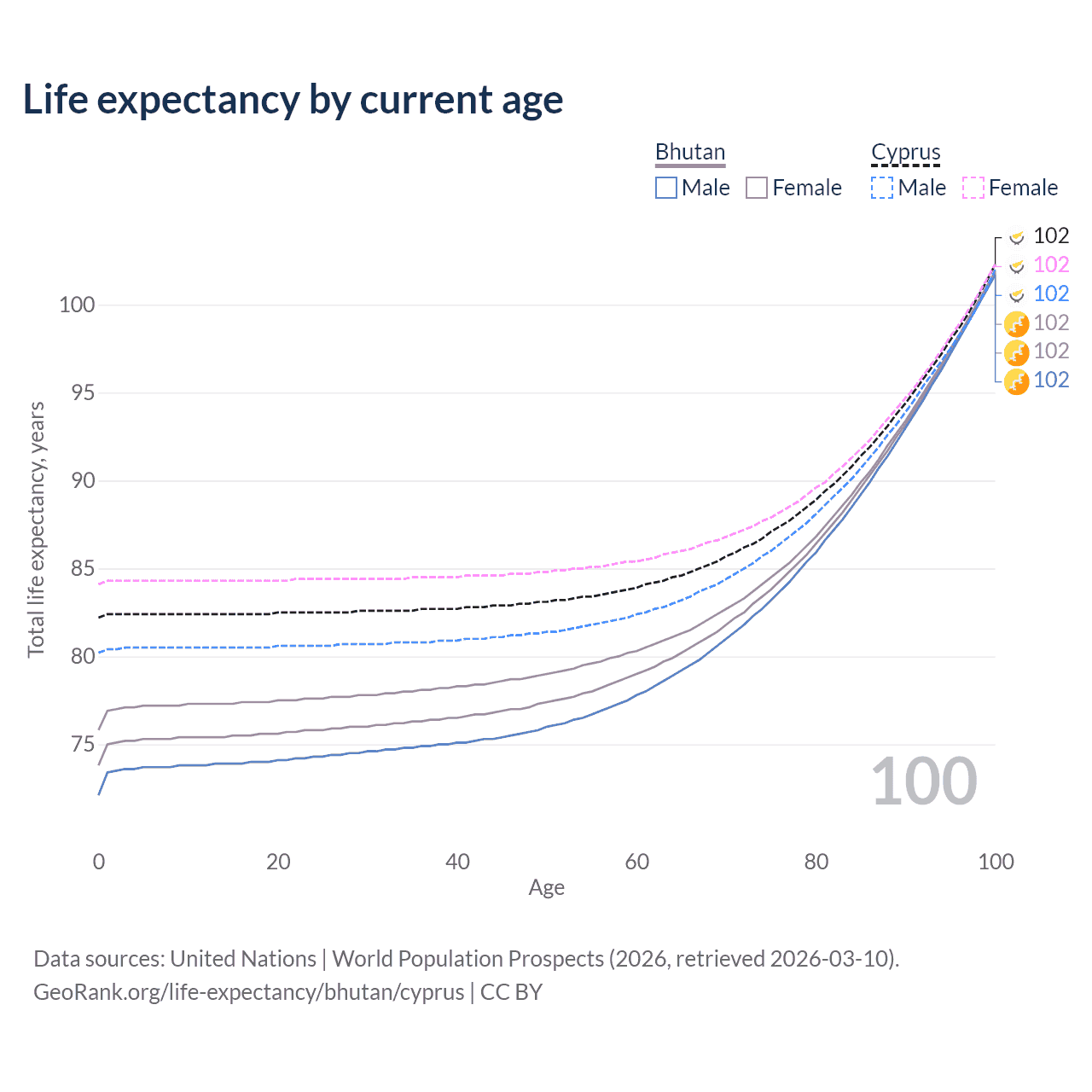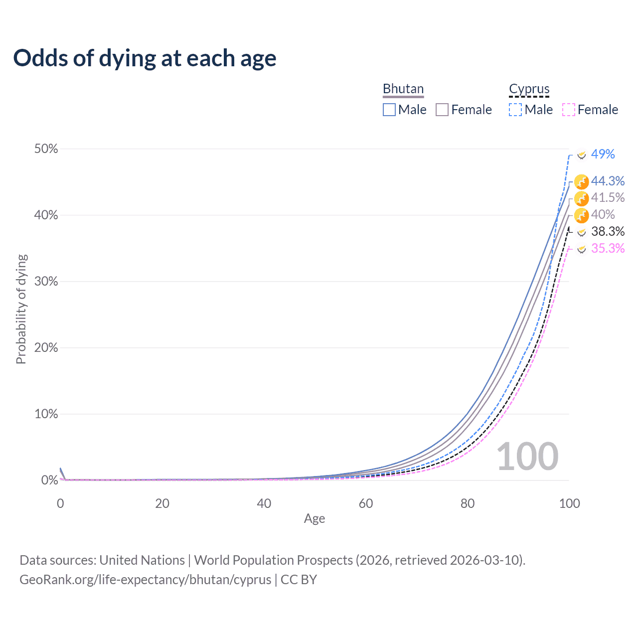 This life expectancy calculator shows the odds of living to 100, 95, 90, and below based on current age for both males and females in Bhutan and Cyprus, along with mean and median age of death. The calculations are based on the 2026 life tables (actuarial tables) from the UN World Population Prospects.