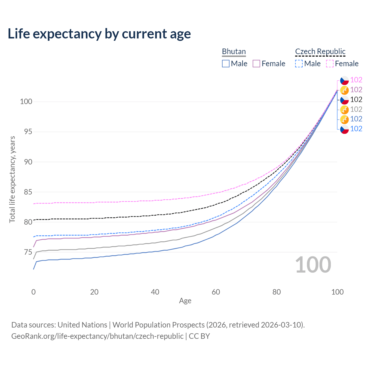 This life expectancy calculator shows the odds of living to 100, 95, 90, and below based on current age for both males and females in Bhutan and the Czech Republic, along with mean and median age of death. The calculations are based on the 2026 life tables (actuarial tables) from the UN World Population Prospects.