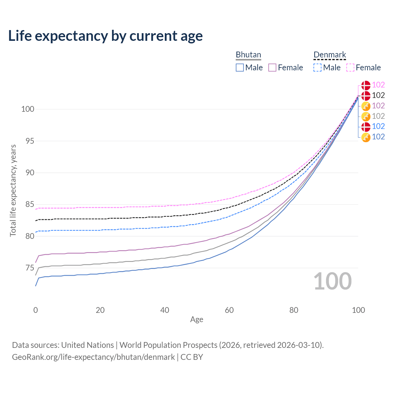 This life expectancy calculator shows the odds of living to 100, 95, 90, and below based on current age for both males and females in Bhutan and Denmark, along with mean and median age of death. The calculations are based on the 2026 life tables (actuarial tables) from the UN World Population Prospects.