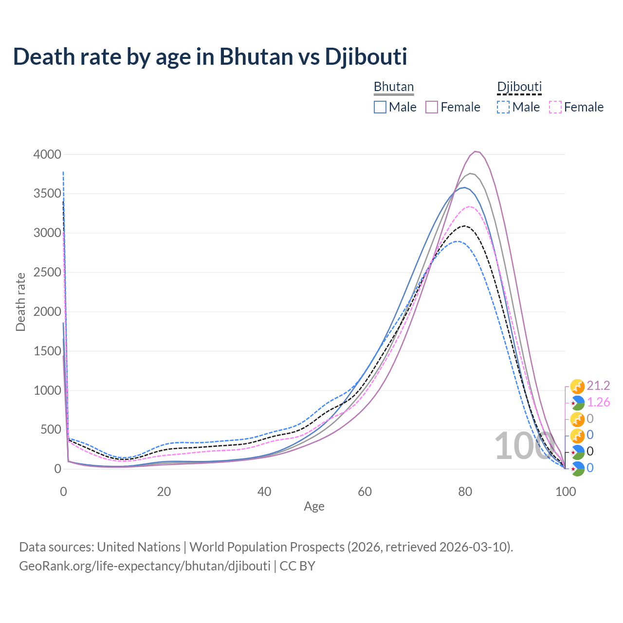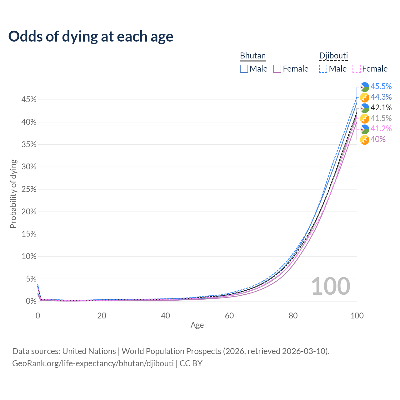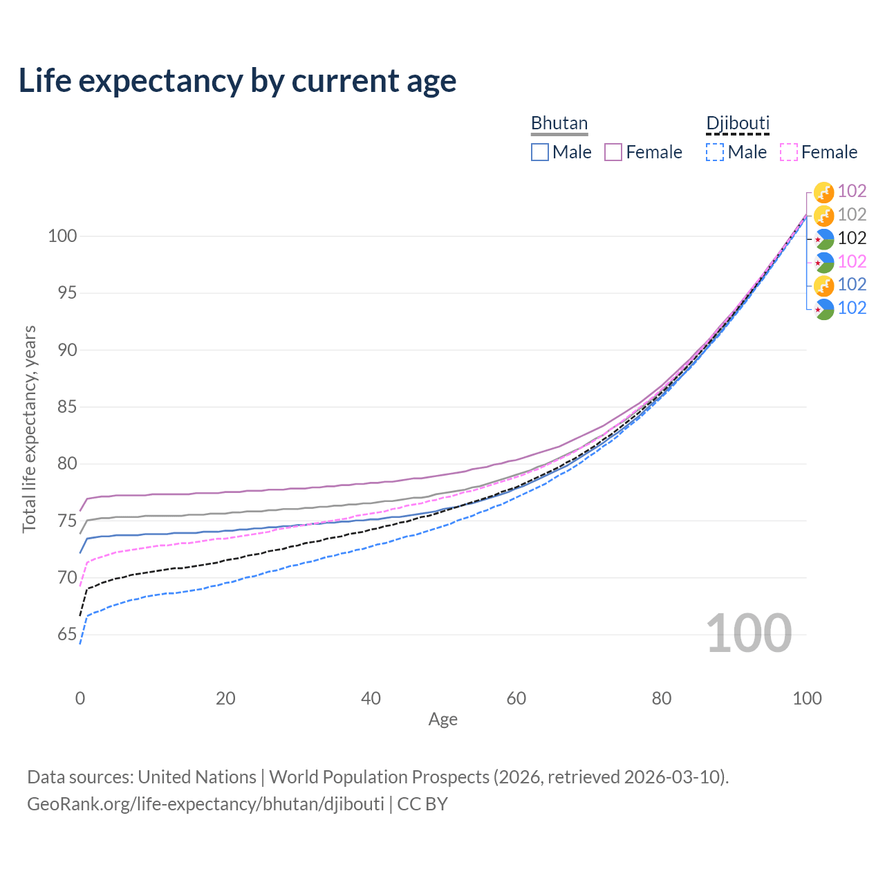 This life expectancy calculator shows the odds of living to 100, 95, 90, and below based on current age for both males and females in Bhutan and Djibouti, along with mean and median age of death. The calculations are based on the 2026 life tables (actuarial tables) from the UN World Population Prospects.