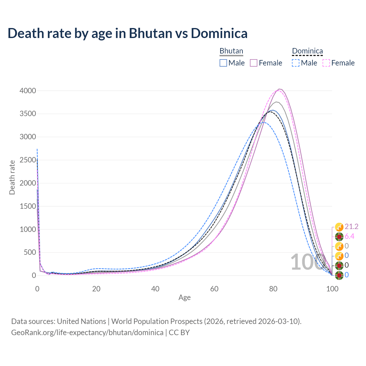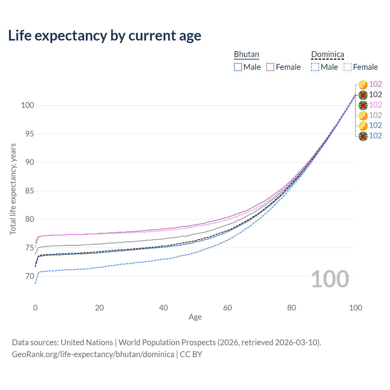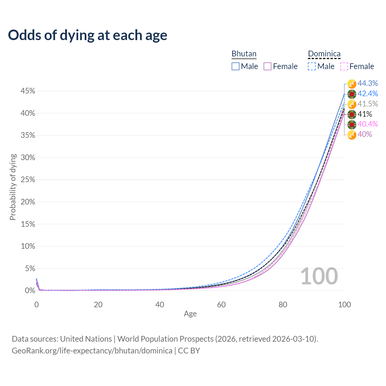 This life expectancy calculator shows the odds of living to 100, 95, 90, and below based on current age for both males and females in Bhutan and Dominica, along with mean and median age of death. The calculations are based on the 2026 life tables (actuarial tables) from the UN World Population Prospects.