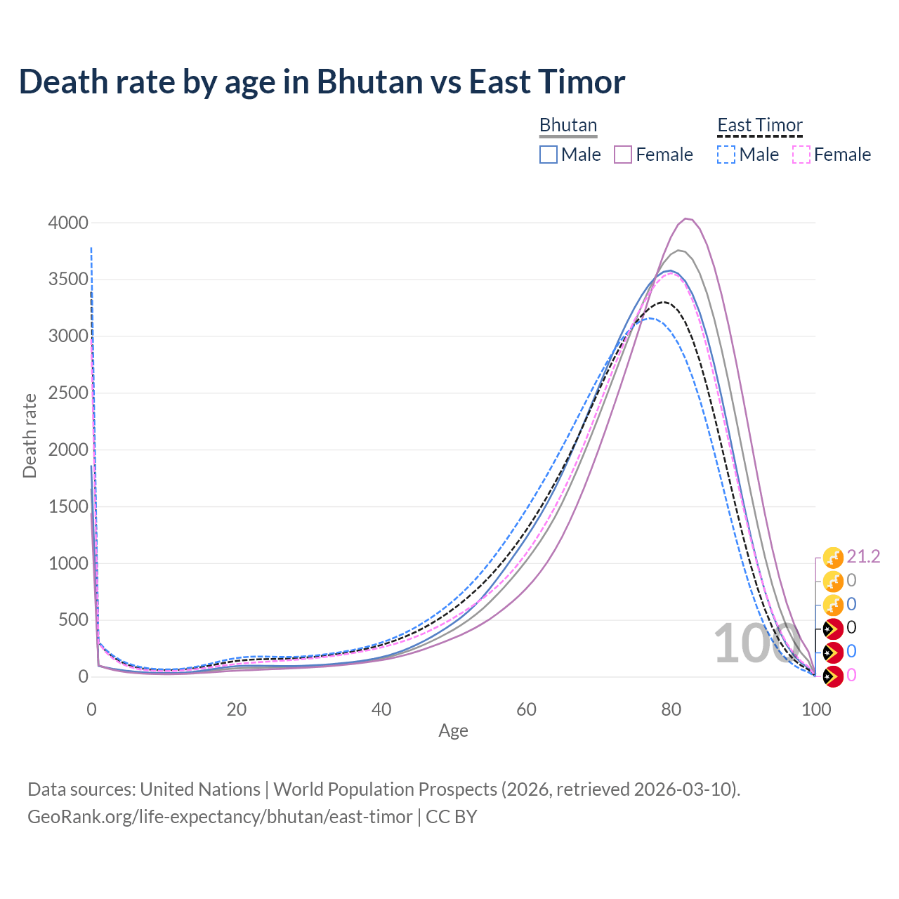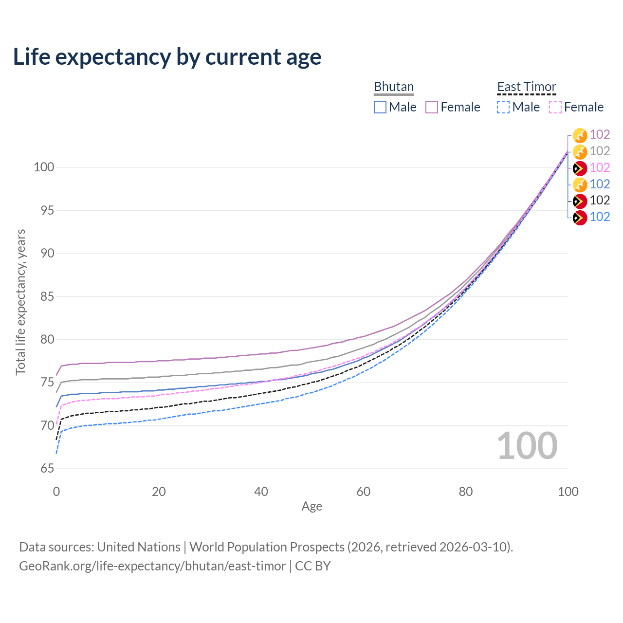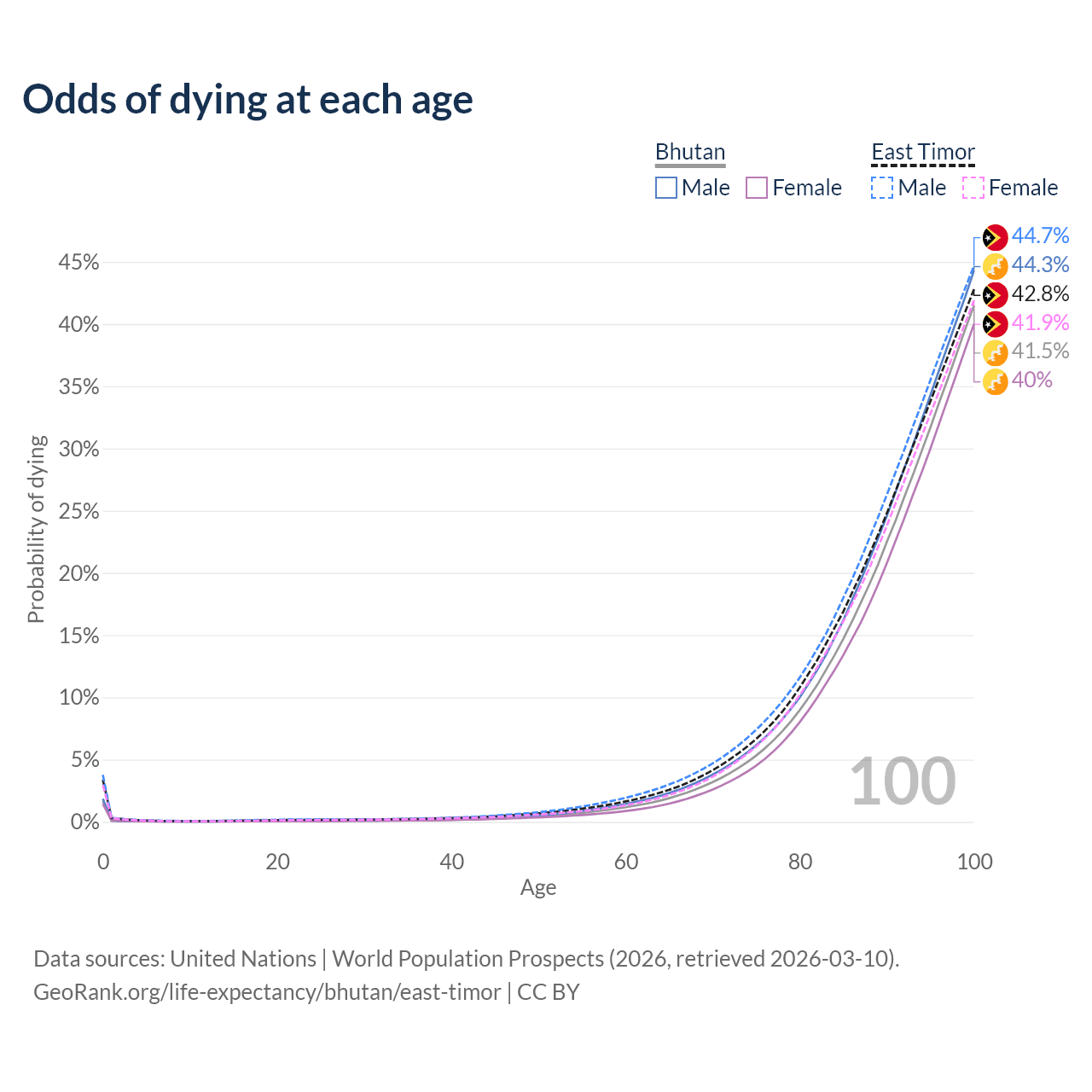 This life expectancy calculator shows the odds of living to 100, 95, 90, and below based on current age for both males and females in Bhutan and East Timor, along with mean and median age of death. The calculations are based on the 2026 life tables (actuarial tables) from the UN World Population Prospects.