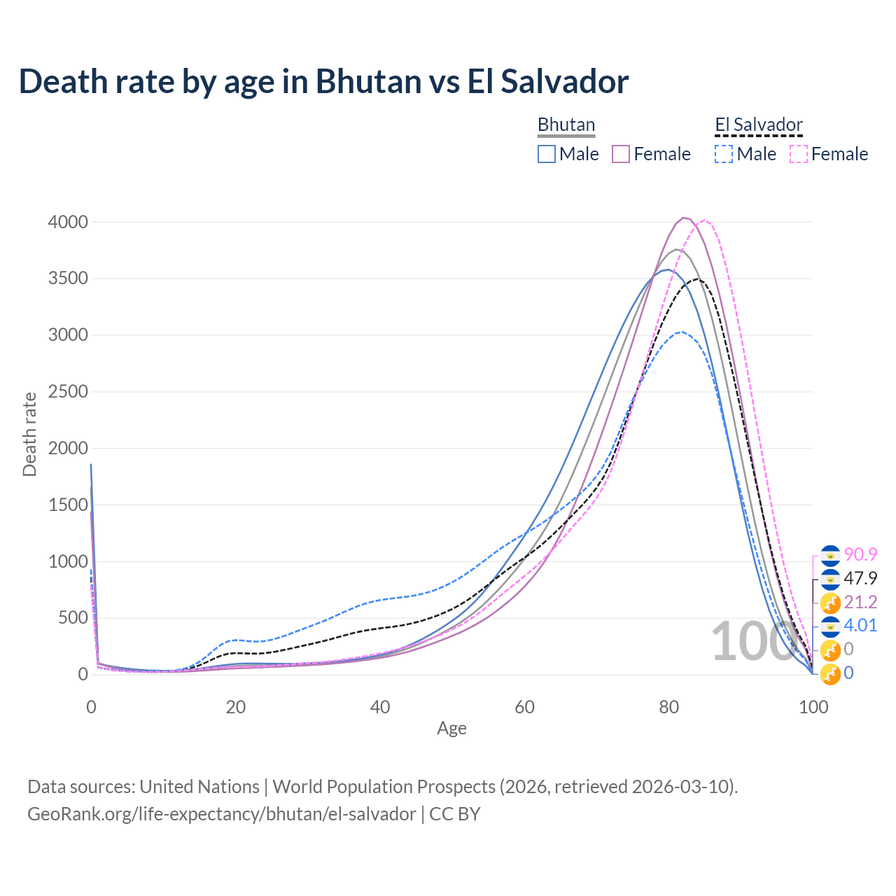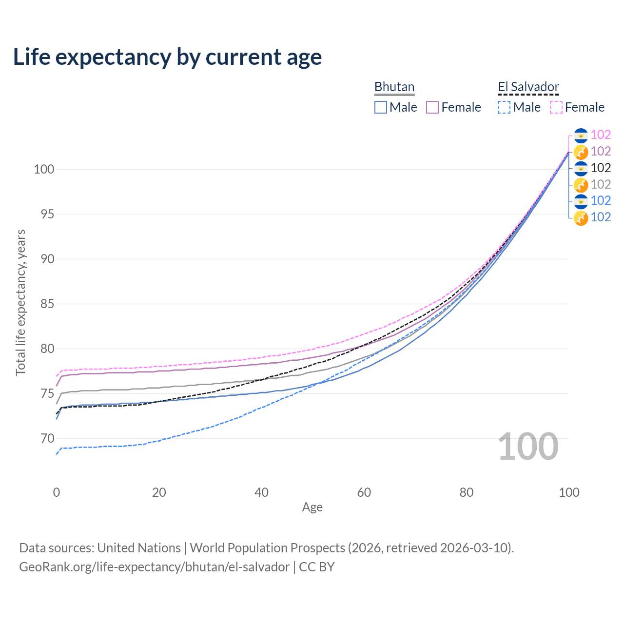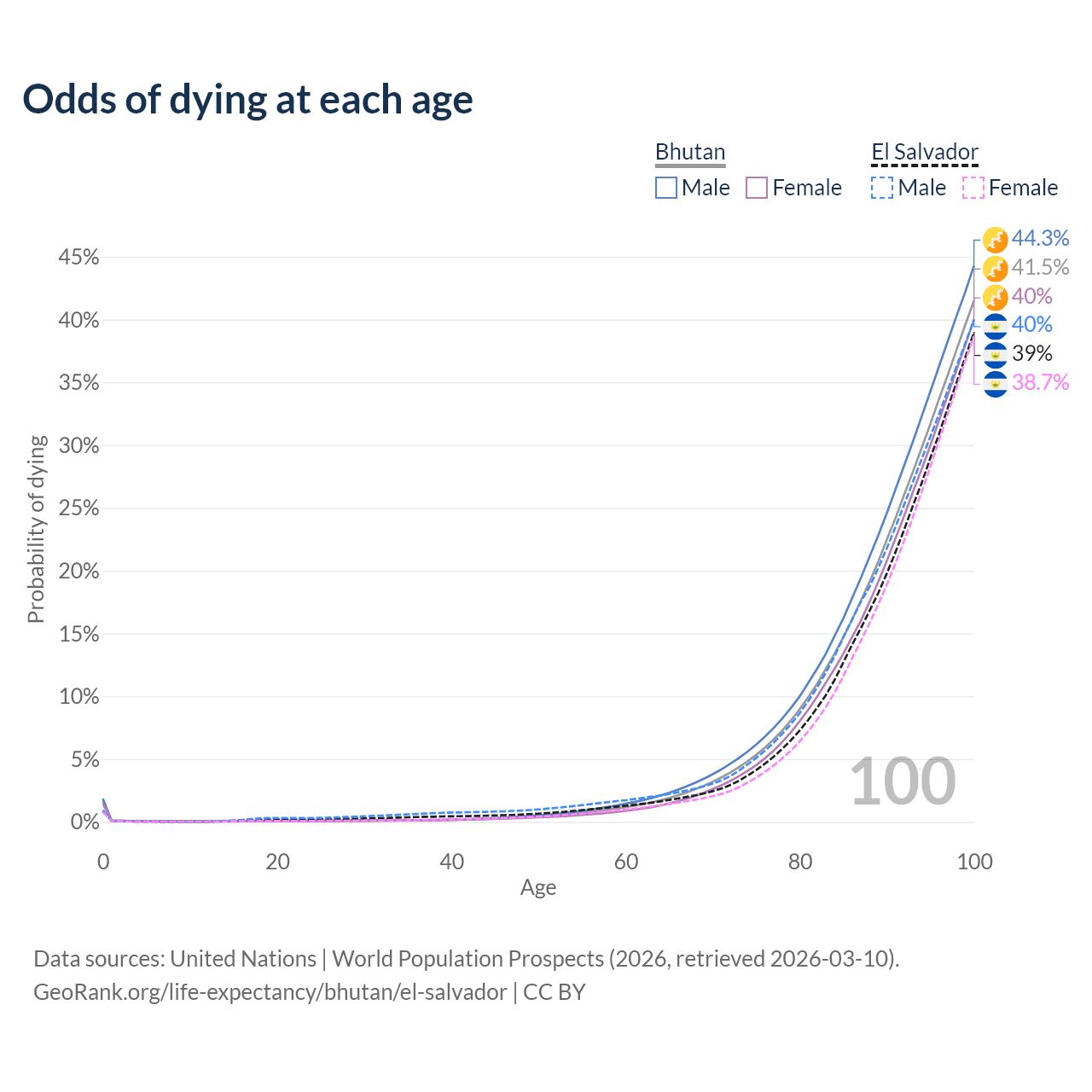 This life expectancy calculator shows the odds of living to 100, 95, 90, and below based on current age for both males and females in Bhutan and El Salvador, along with mean and median age of death. The calculations are based on the 2026 life tables (actuarial tables) from the UN World Population Prospects.