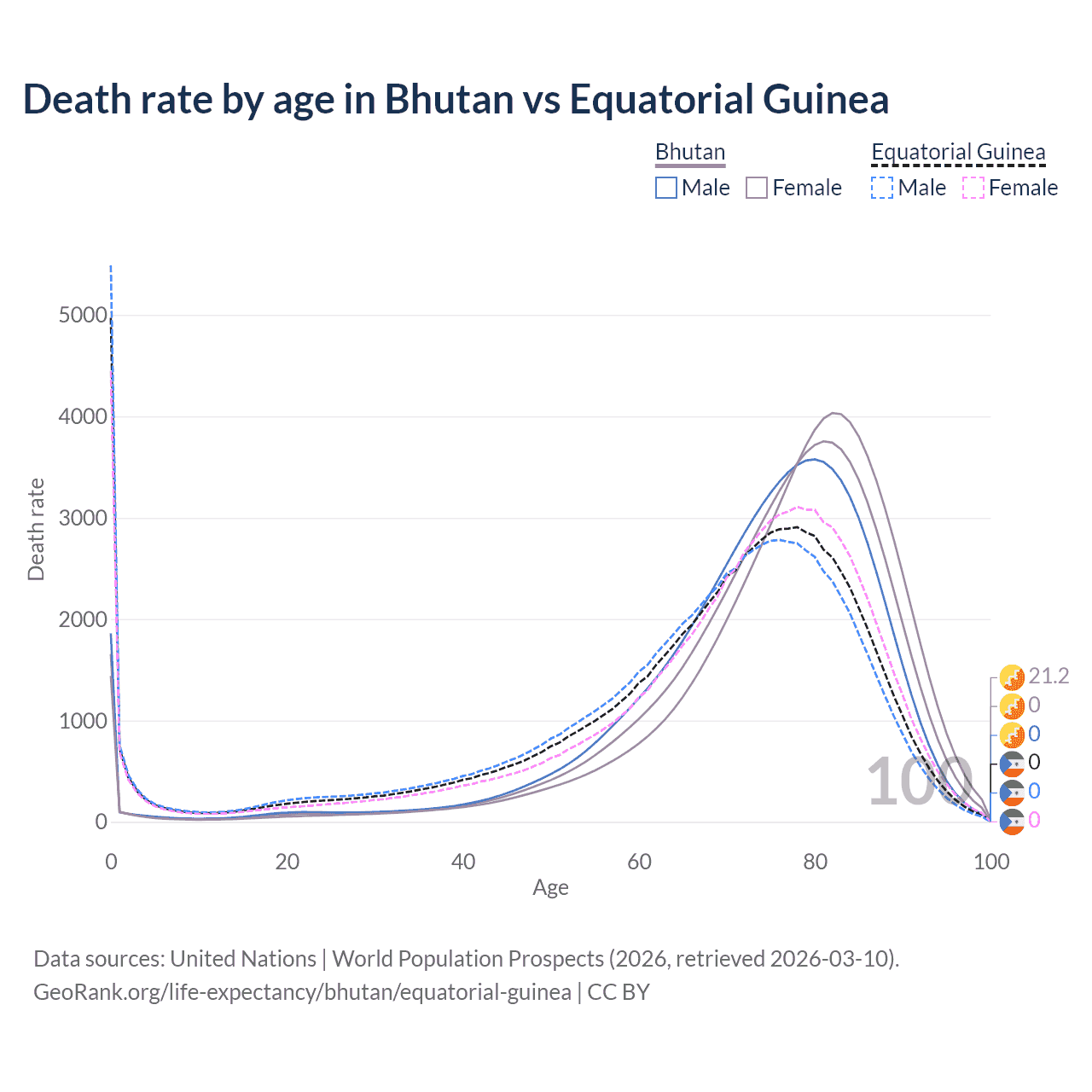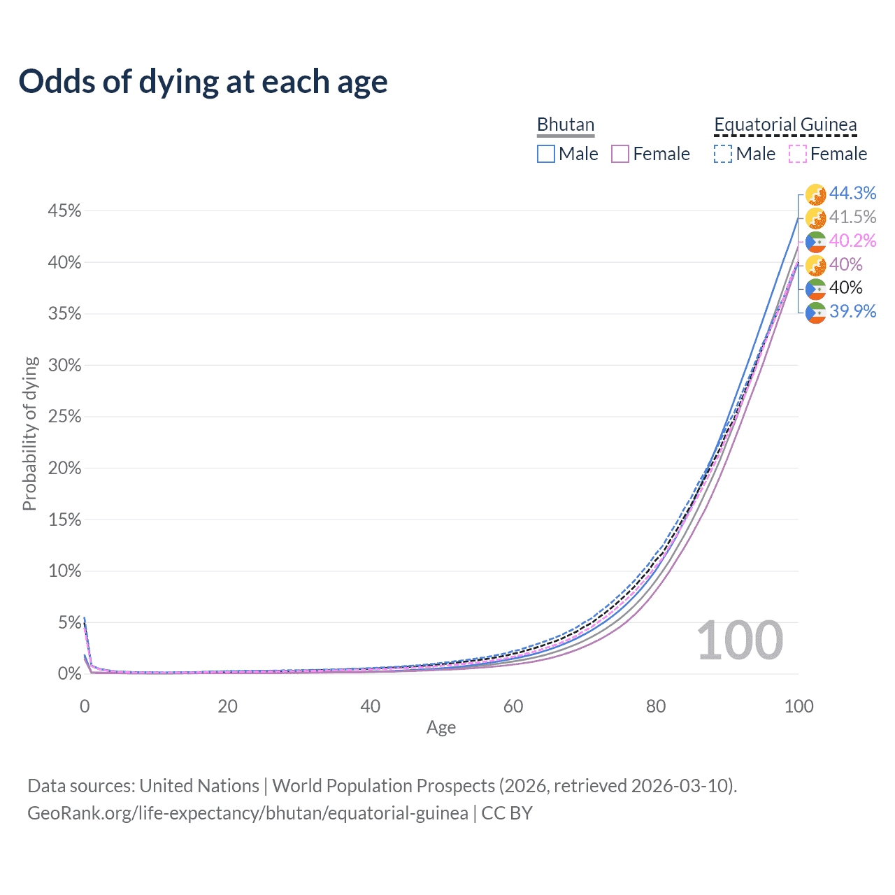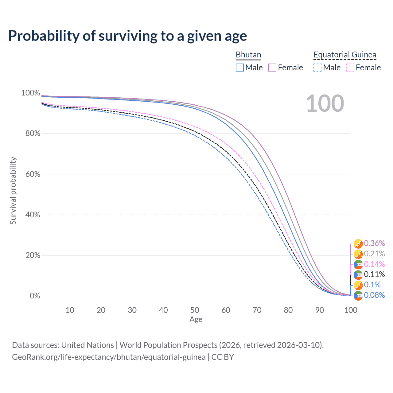 This life expectancy calculator shows the odds of living to 100, 95, 90, and below based on current age for both males and females in Bhutan and Equatorial Guinea, along with mean and median age of death. The calculations are based on the 2026 life tables (actuarial tables) from the UN World Population Prospects.