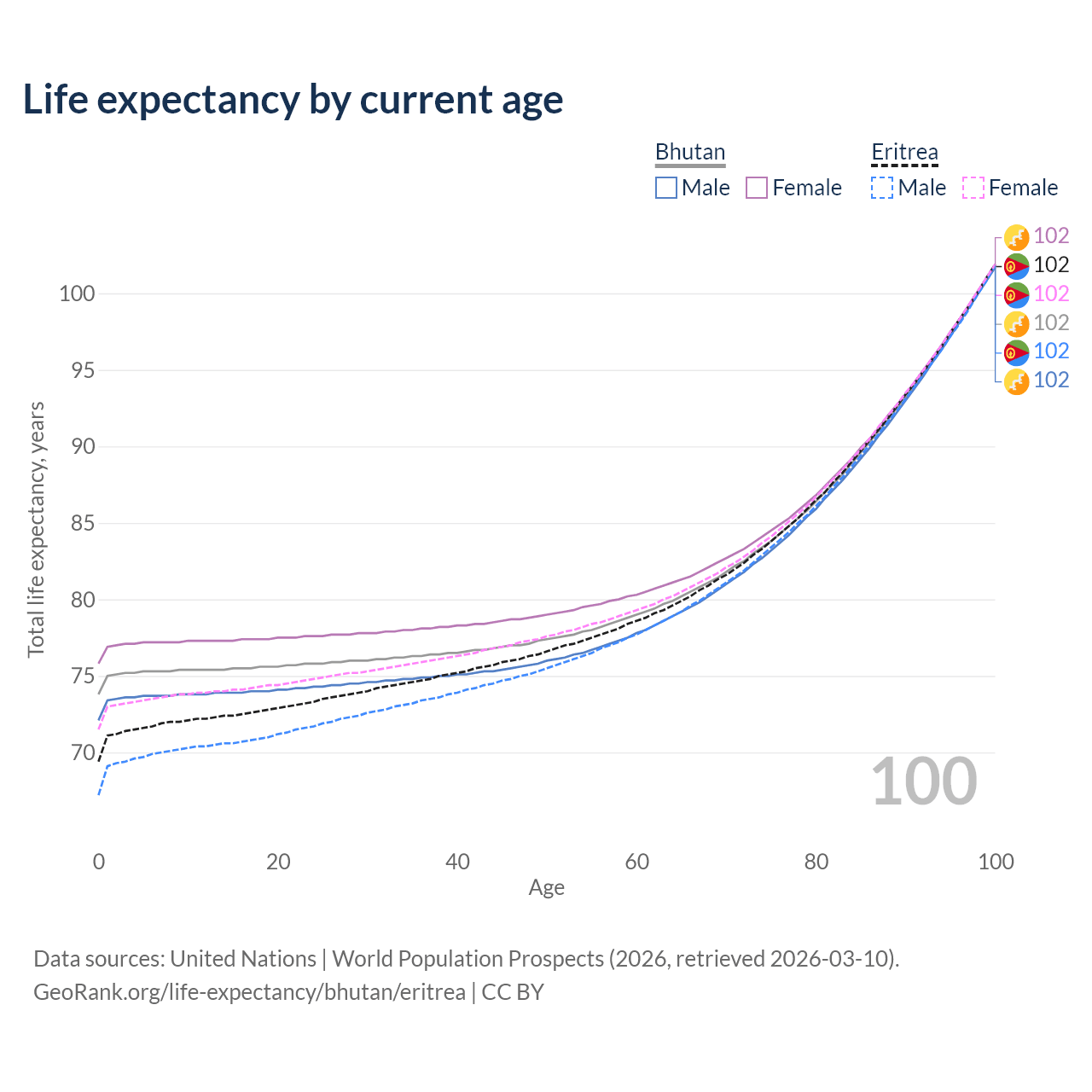 This life expectancy calculator shows the odds of living to 100, 95, 90, and below based on current age for both males and females in Bhutan and Eritrea, along with mean and median age of death. The calculations are based on the 2026 life tables (actuarial tables) from the UN World Population Prospects.