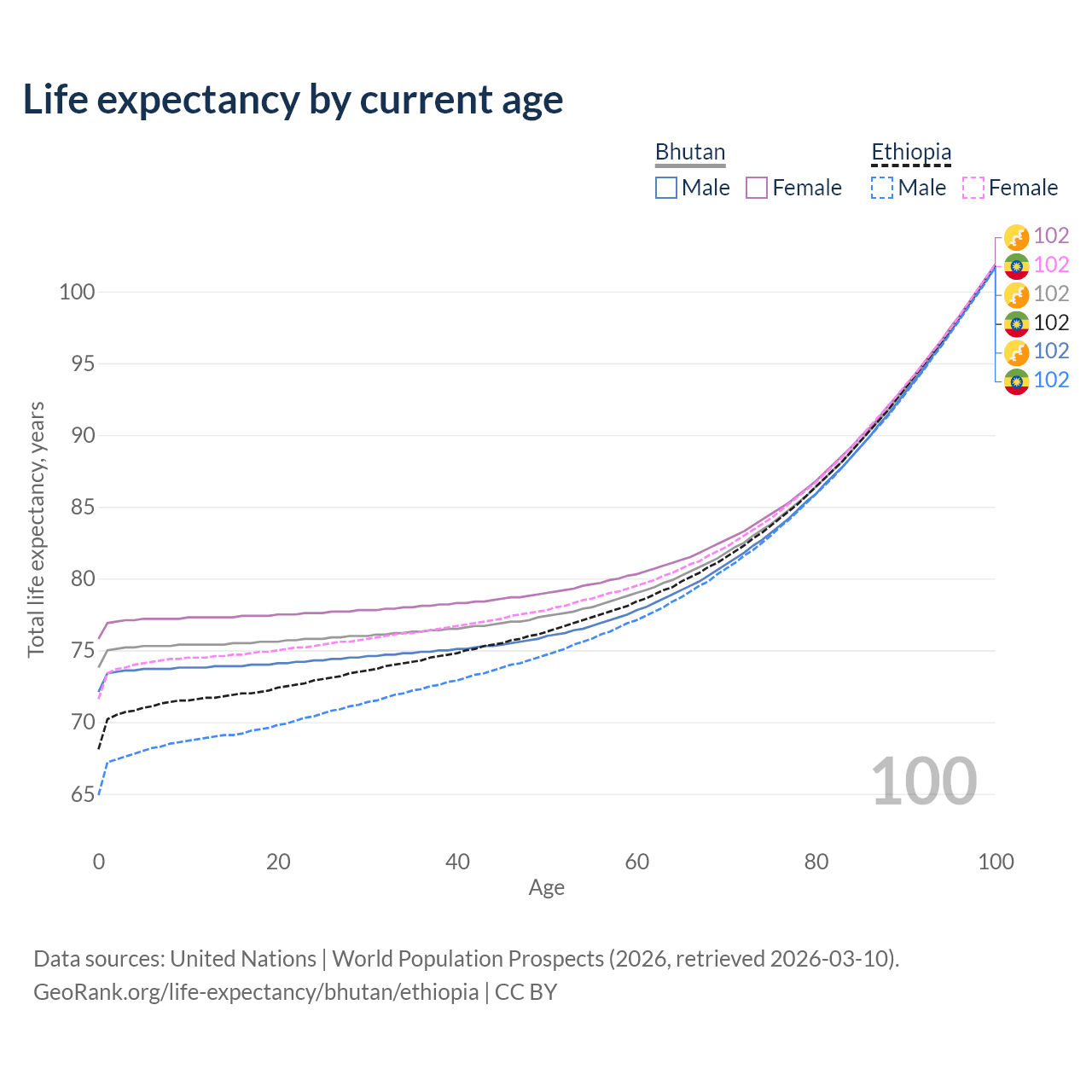 This life expectancy calculator shows the odds of living to 100, 95, 90, and below based on current age for both males and females in Bhutan and Ethiopia, along with mean and median age of death. The calculations are based on the 2026 life tables (actuarial tables) from the UN World Population Prospects.