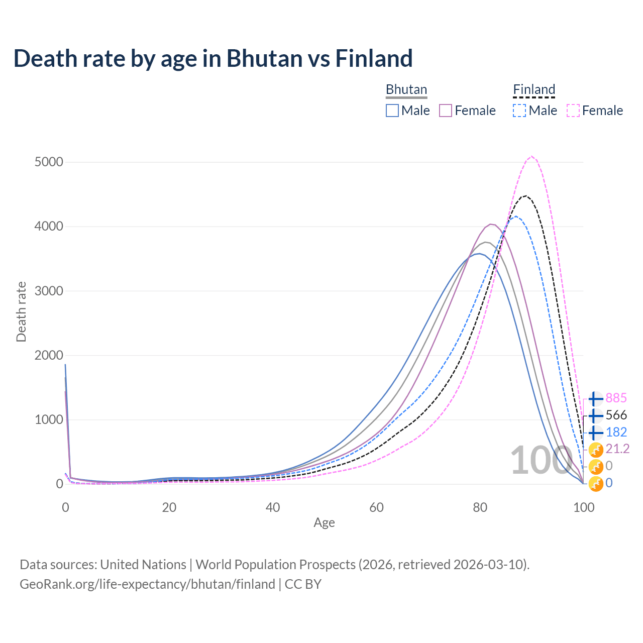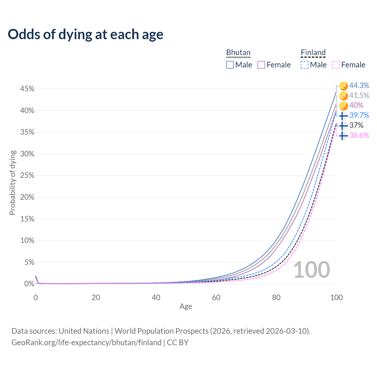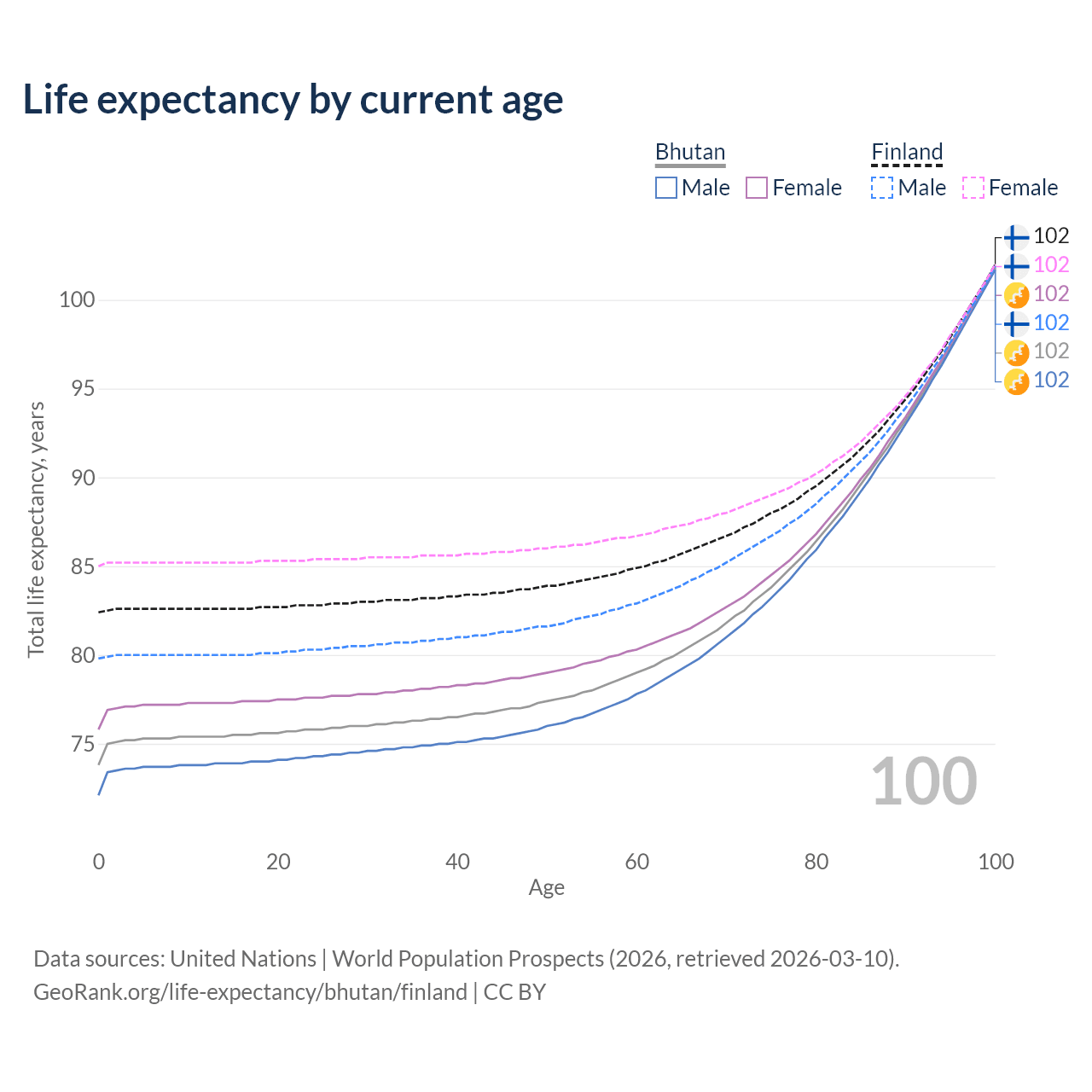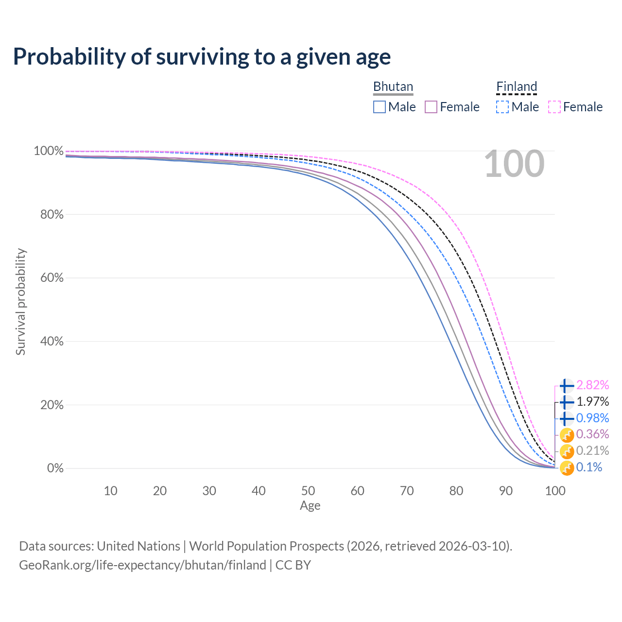 This life expectancy calculator shows the odds of living to 100, 95, 90, and below based on current age for both males and females in Bhutan and Finland, along with mean and median age of death. The calculations are based on the 2026 life tables (actuarial tables) from the UN World Population Prospects.
