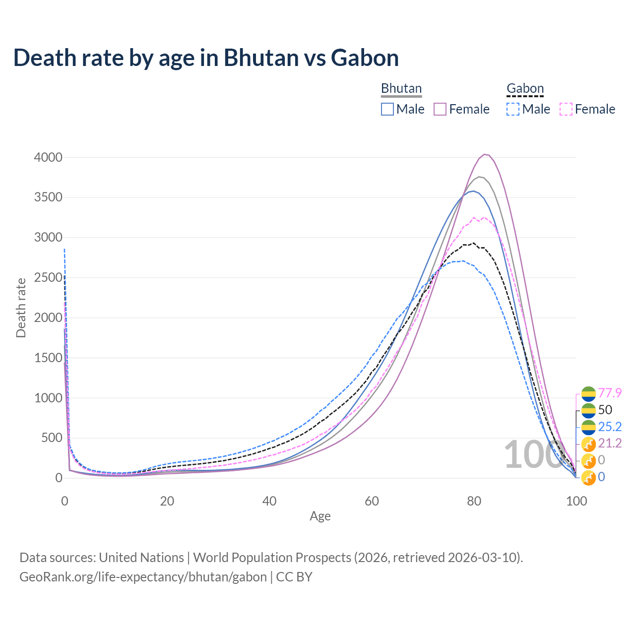 In Bhutan, the most common age of death is 81, compared to 80 in Gabon. The median age of death is 77.6 in Bhutan and 73.9 in Gabon, meaning only half of each cohort is expected to live past that age.