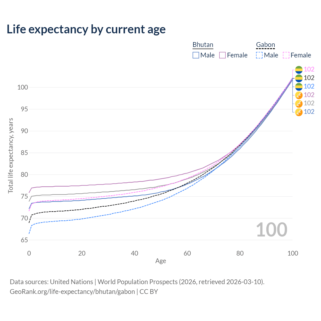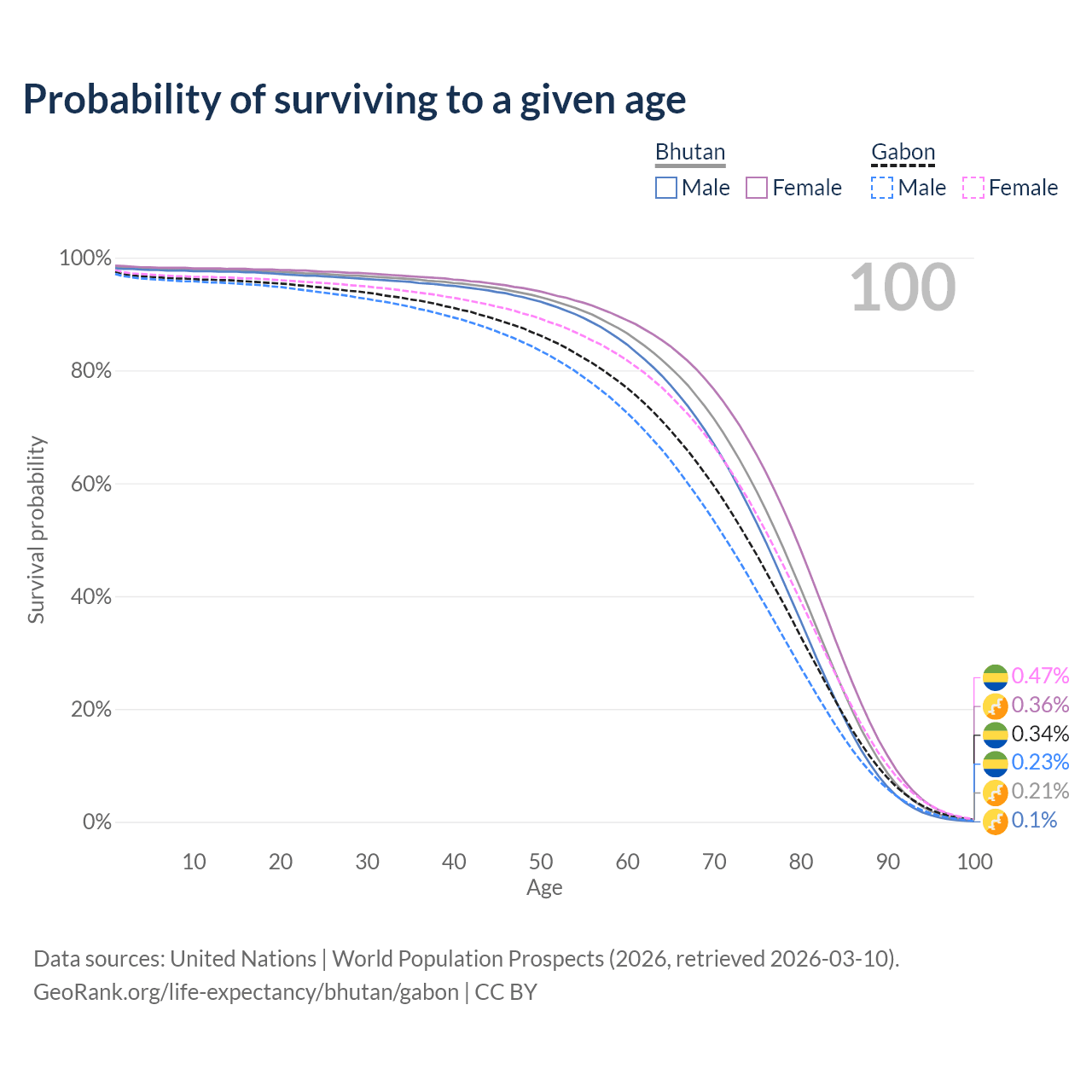 This life expectancy calculator shows the odds of living to 100, 95, 90, and below based on current age for both males and females in Bhutan and Gabon, along with mean and median age of death. The calculations are based on the 2026 life tables (actuarial tables) from the UN World Population Prospects.