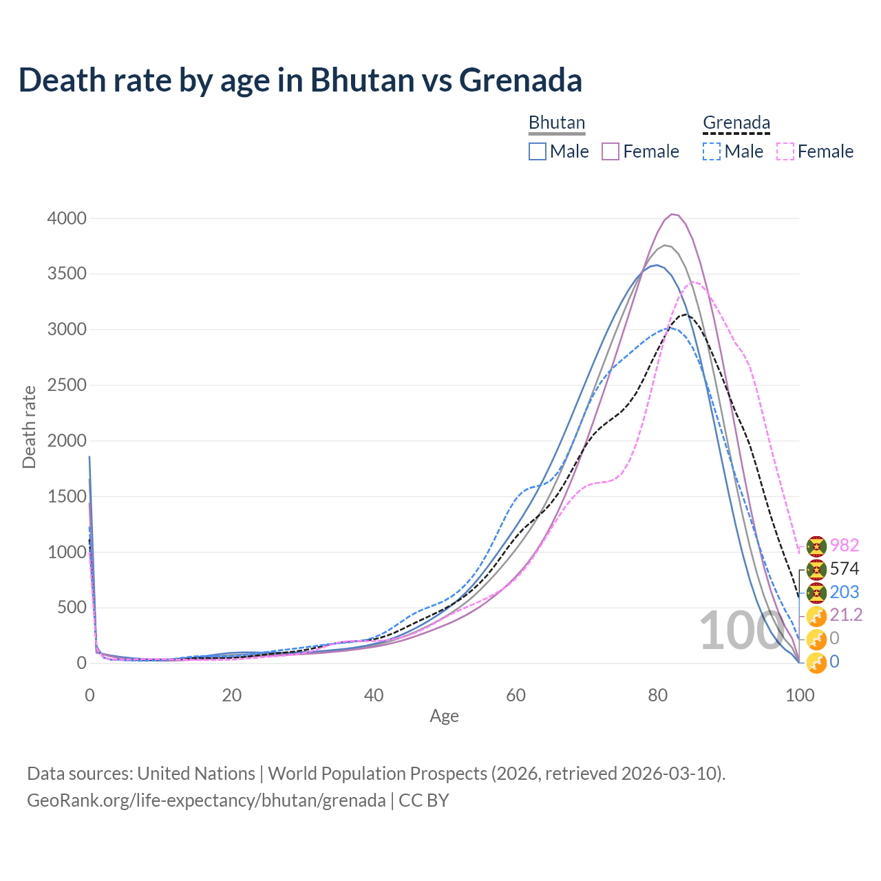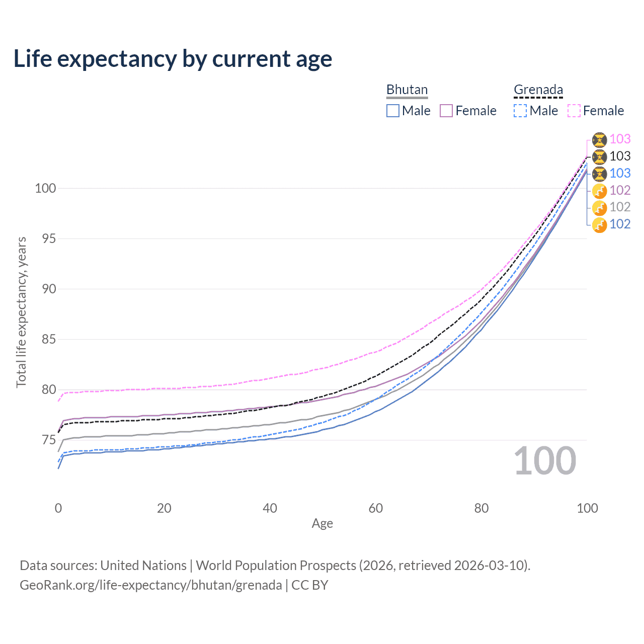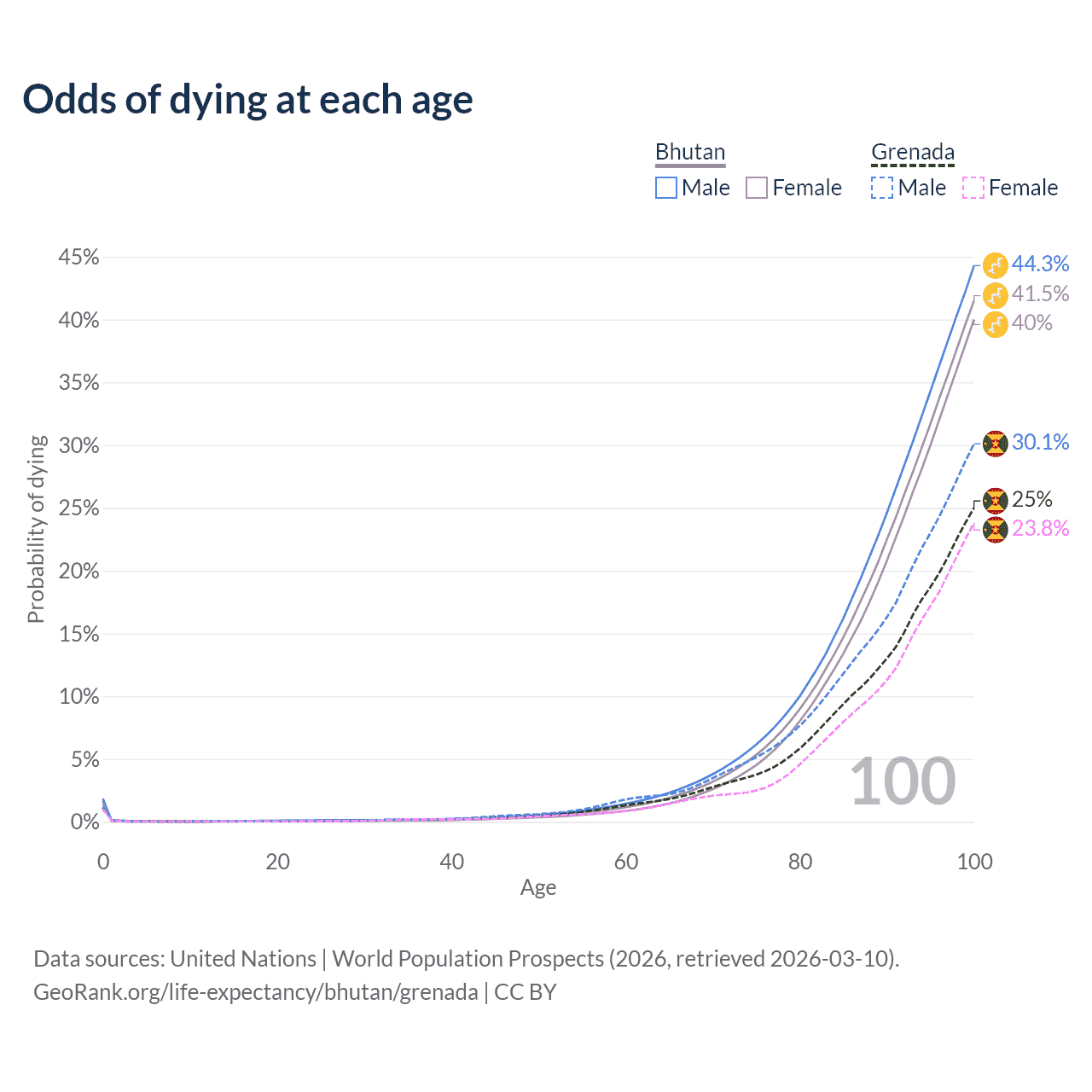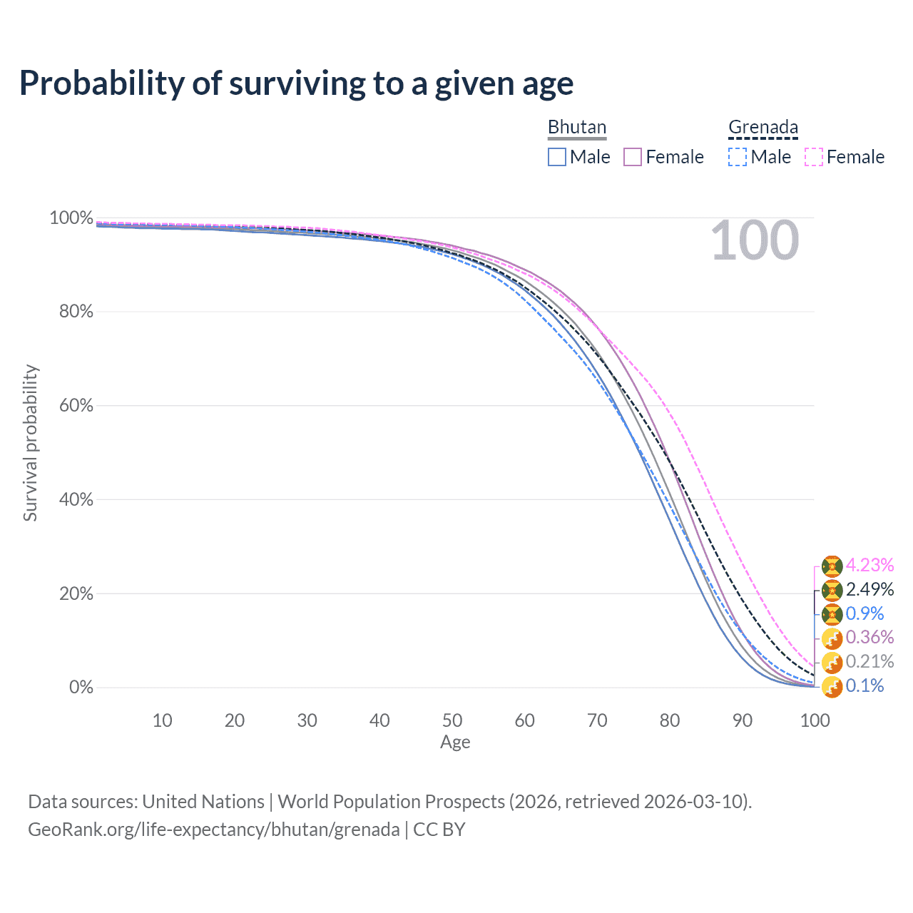 This life expectancy calculator shows the odds of living to 100, 95, 90, and below based on current age for both males and females in Bhutan and Grenada, along with mean and median age of death. The calculations are based on the 2026 life tables (actuarial tables) from the UN World Population Prospects.