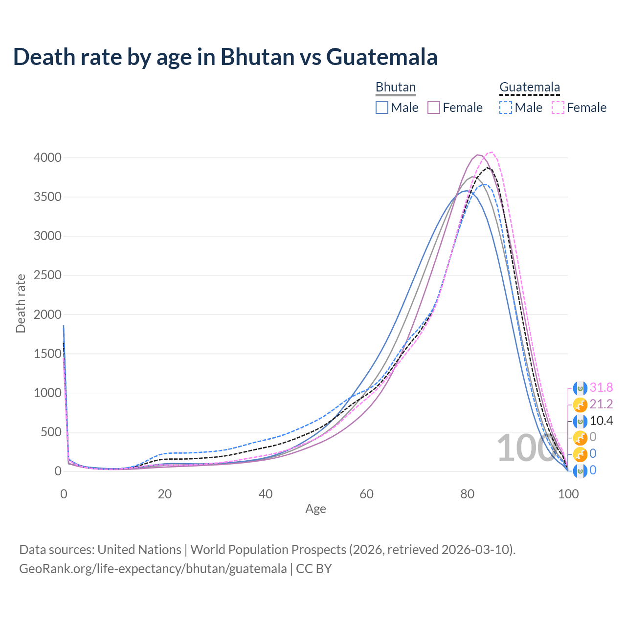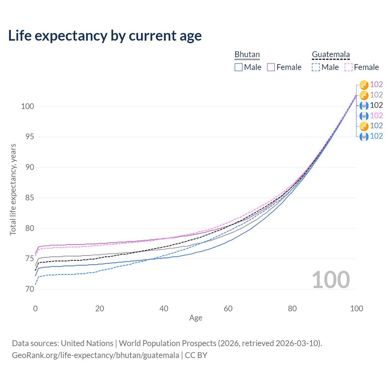 This life expectancy calculator shows the odds of living to 100, 95, 90, and below based on current age for both males and females in Bhutan and Guatemala, along with mean and median age of death. The calculations are based on the 2026 life tables (actuarial tables) from the UN World Population Prospects.