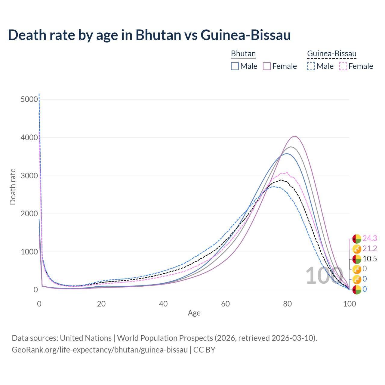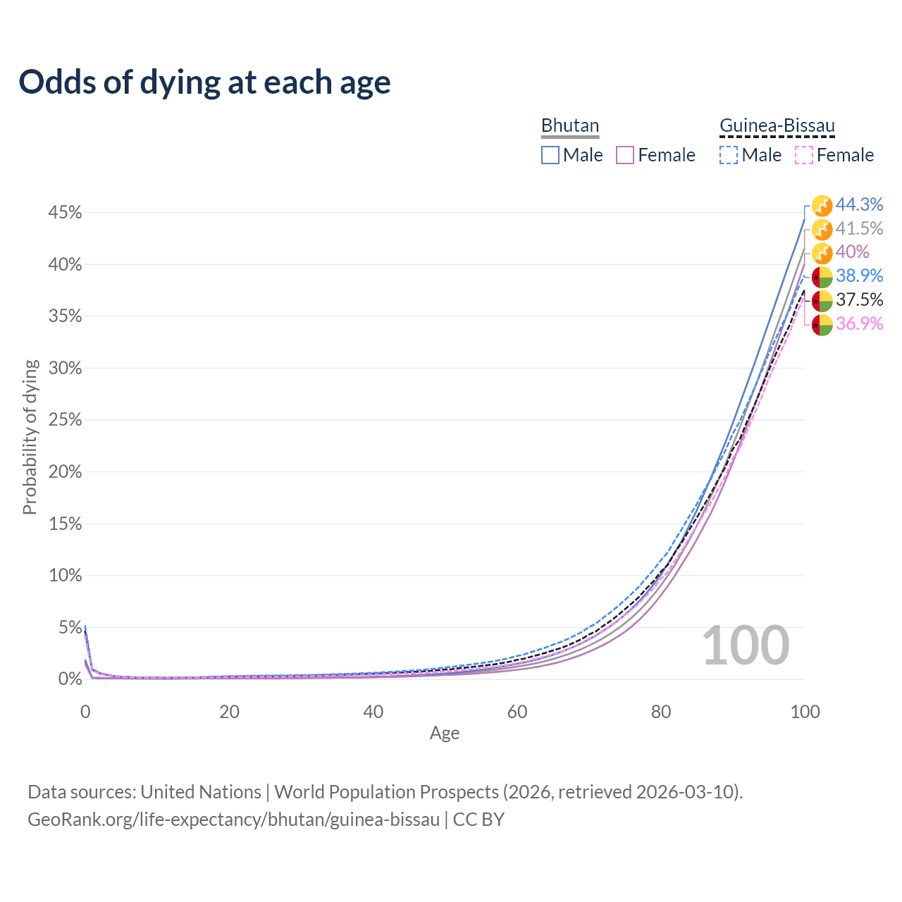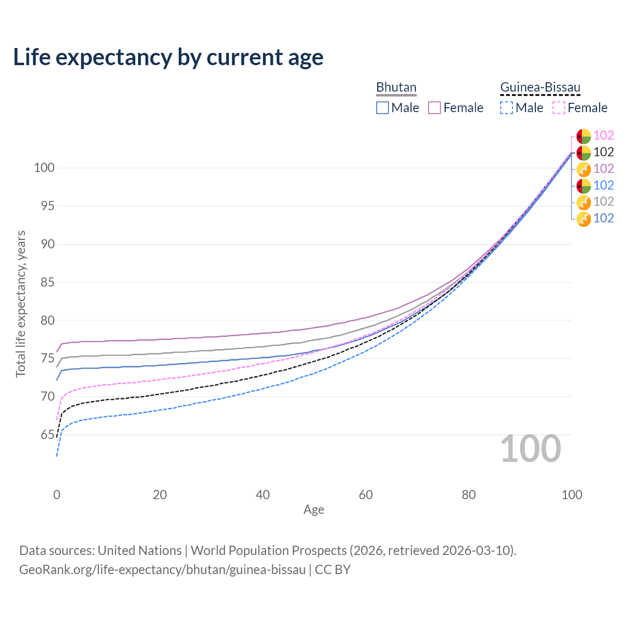 This life expectancy calculator shows the odds of living to 100, 95, 90, and below based on current age for both males and females in Bhutan and Guinea-Bissau, along with mean and median age of death. The calculations are based on the 2026 life tables (actuarial tables) from the UN World Population Prospects.