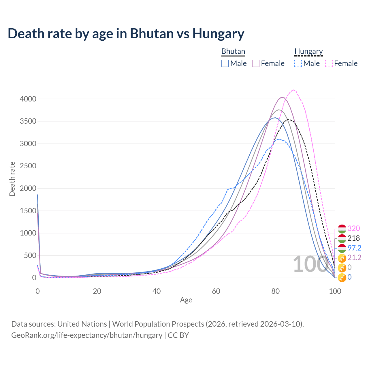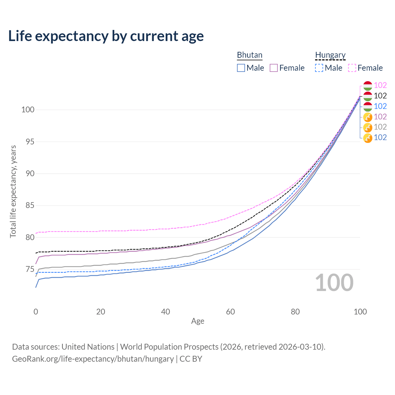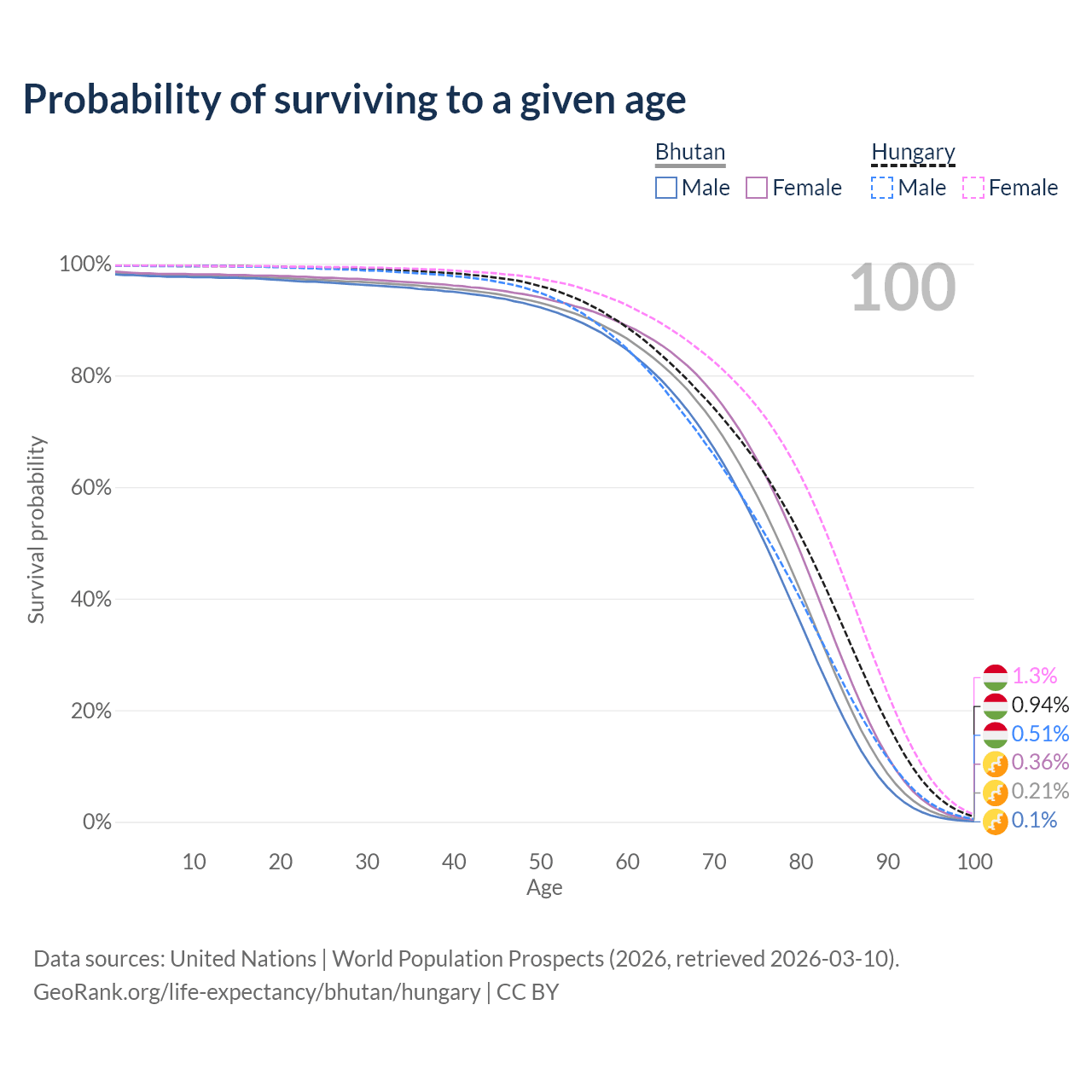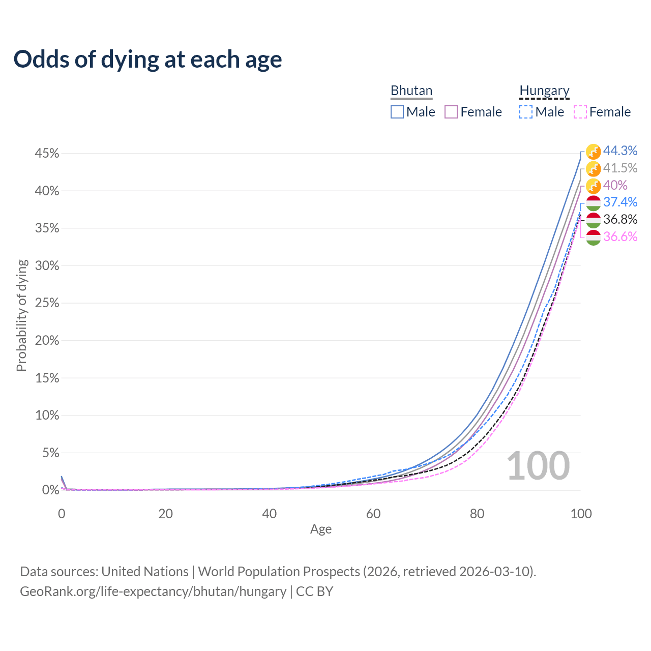 This life expectancy calculator shows the odds of living to 100, 95, 90, and below based on current age for both males and females in Bhutan and Hungary, along with mean and median age of death. The calculations are based on the 2026 life tables (actuarial tables) from the UN World Population Prospects.