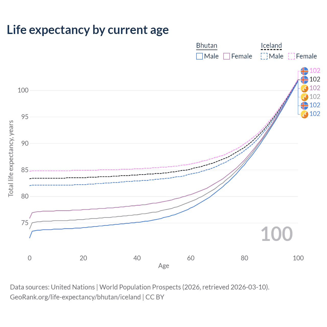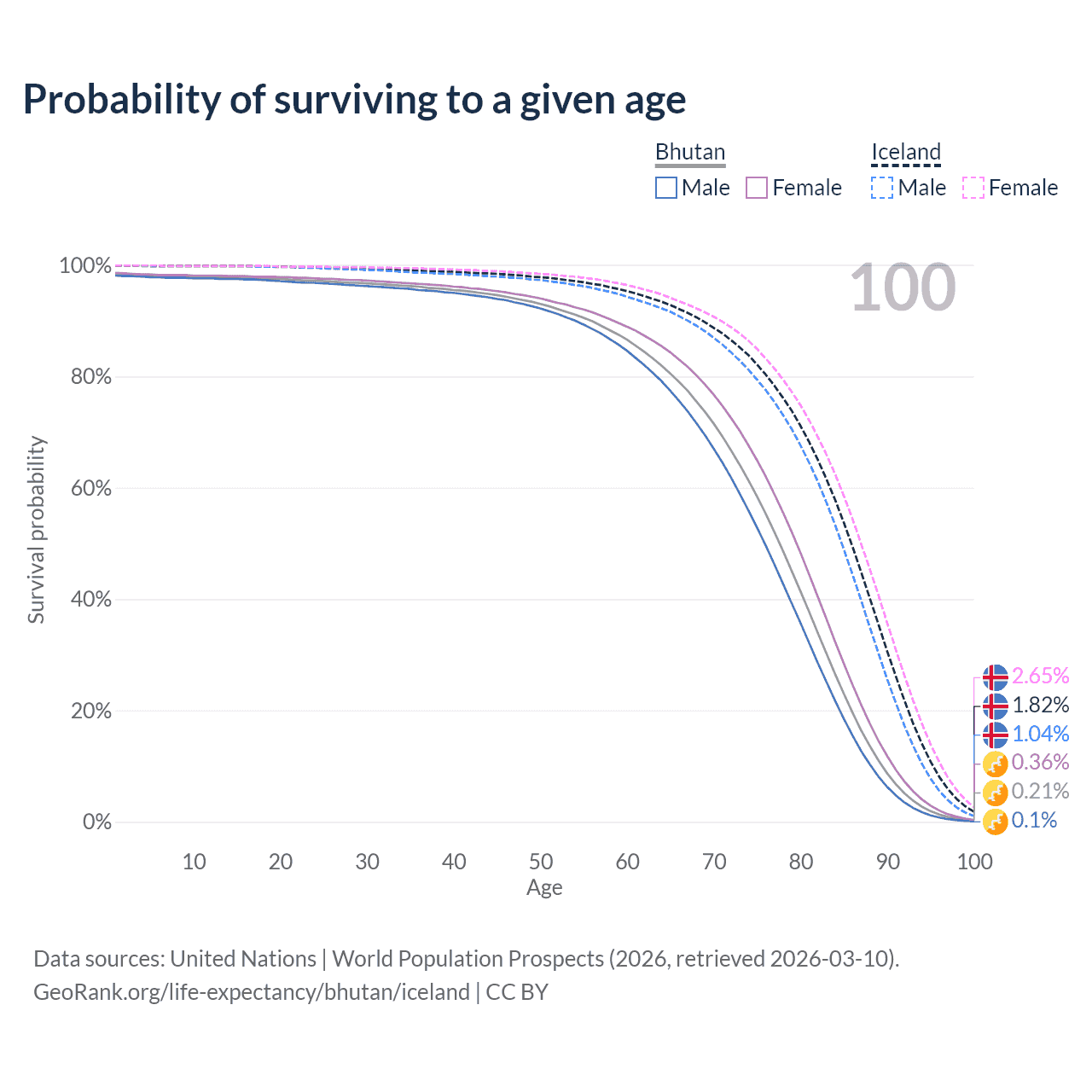 This life expectancy calculator shows the odds of living to 100, 95, 90, and below based on current age for both males and females in Bhutan and Iceland, along with mean and median age of death. The calculations are based on the 2026 life tables (actuarial tables) from the UN World Population Prospects.
