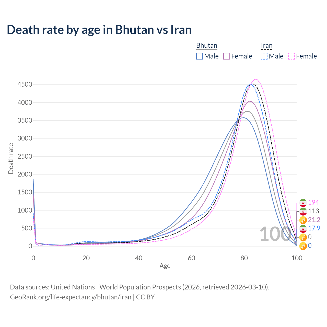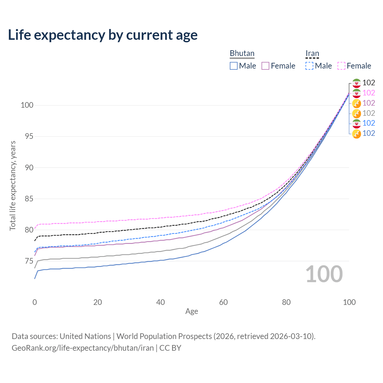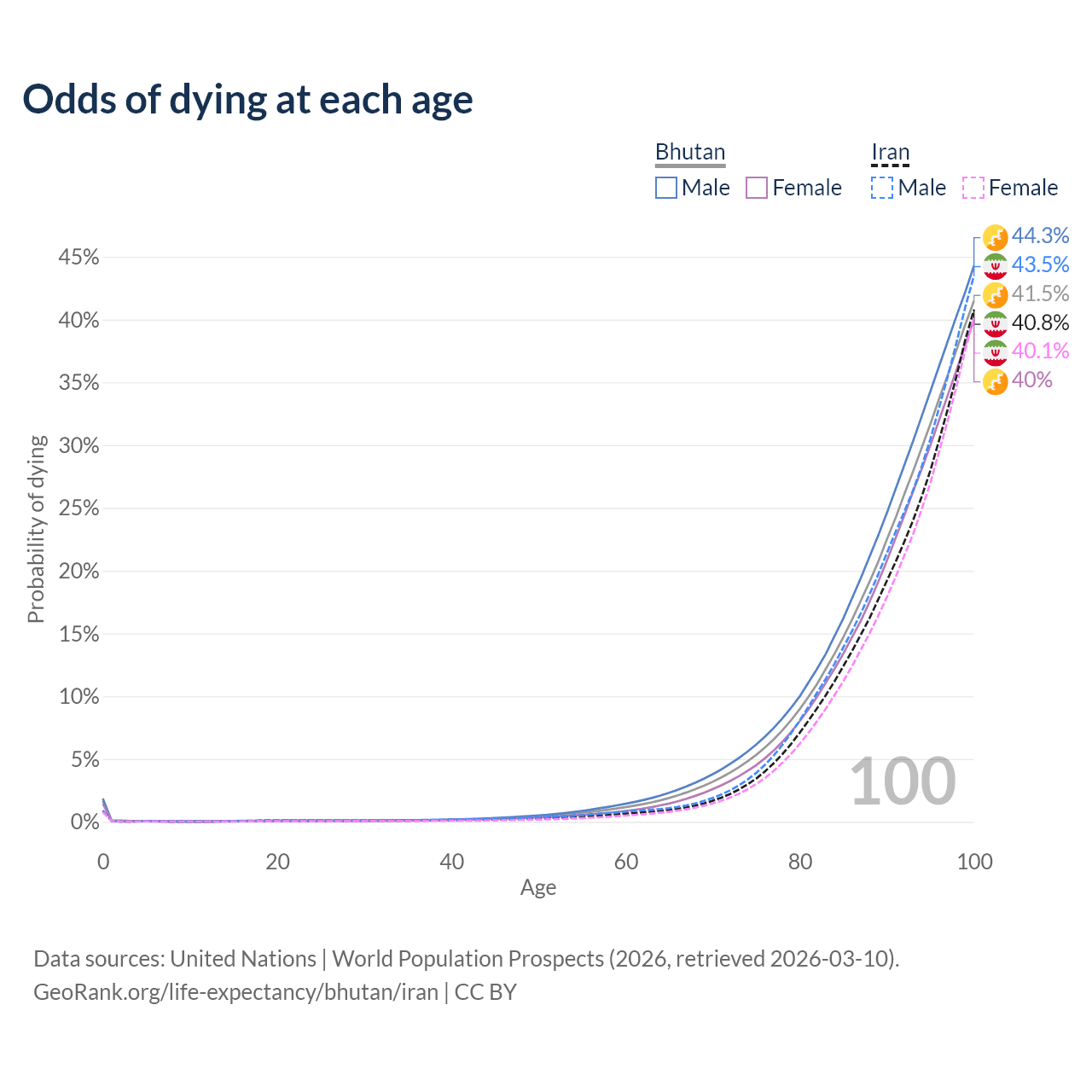 This life expectancy calculator shows the odds of living to 100, 95, 90, and below based on current age for both males and females in Bhutan and Iran, along with mean and median age of death. The calculations are based on the 2026 life tables (actuarial tables) from the UN World Population Prospects.