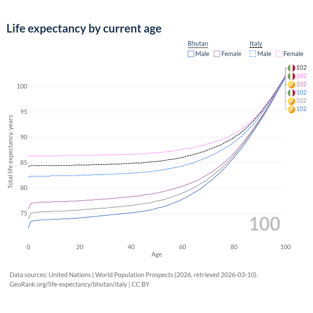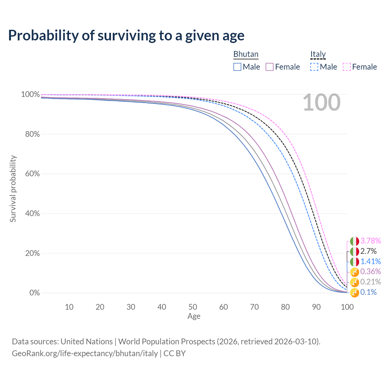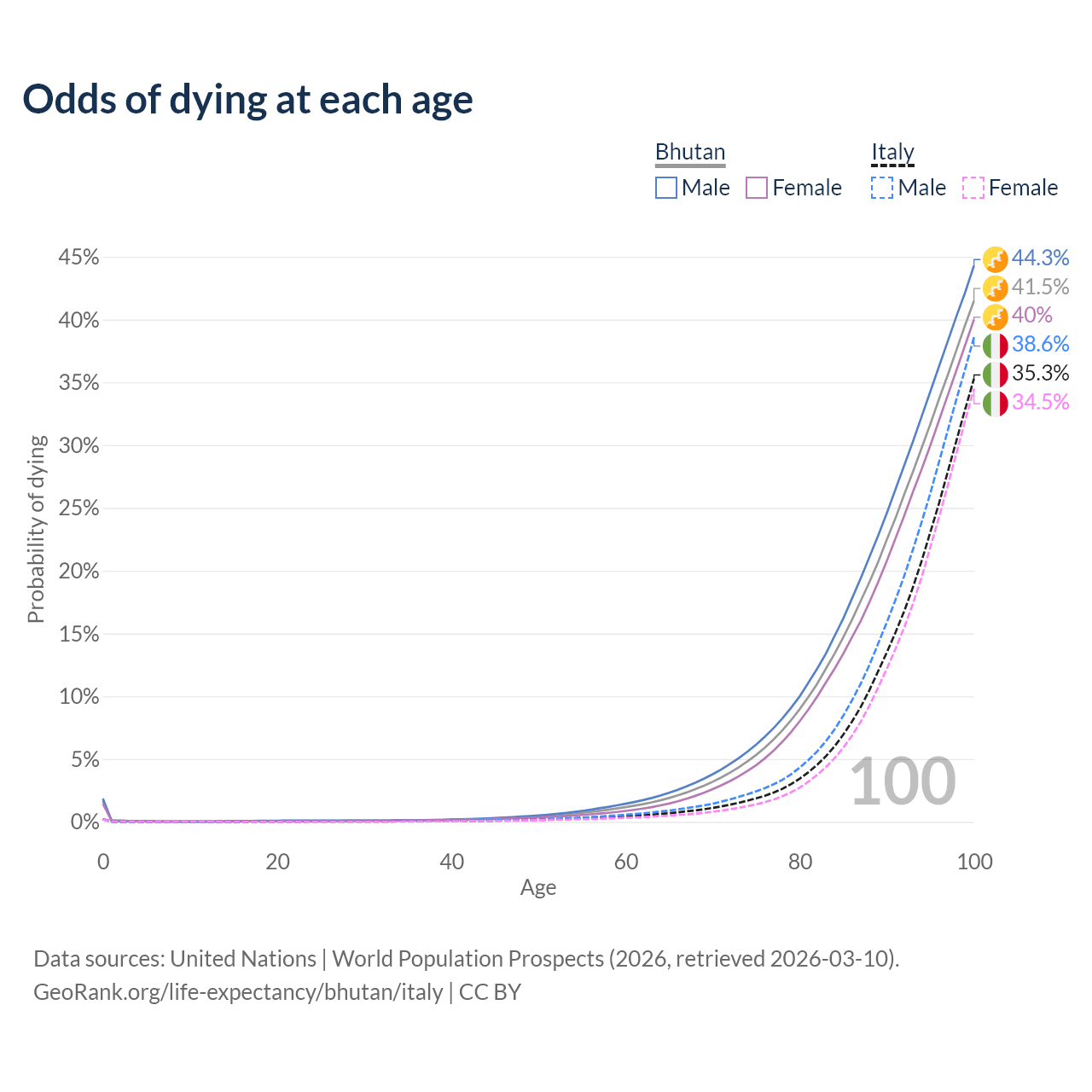 This life expectancy calculator shows the odds of living to 100, 95, 90, and below based on current age for both males and females in Bhutan and Italy, along with mean and median age of death. The calculations are based on the 2026 life tables (actuarial tables) from the UN World Population Prospects.