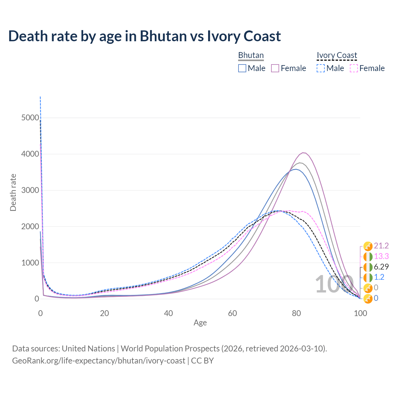 In Bhutan, the most common age of death is 81, compared to 0 in Ivory Coast. The median age of death is 77.6 in Bhutan and 68.6 in Ivory Coast, meaning only half of each cohort is expected to live past that age.