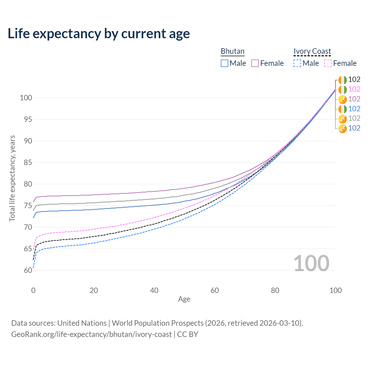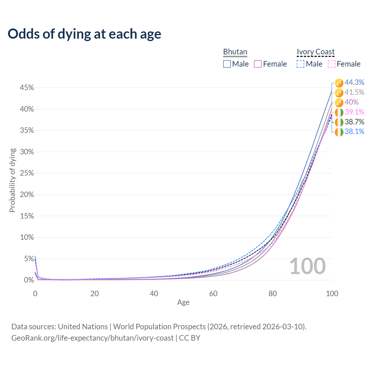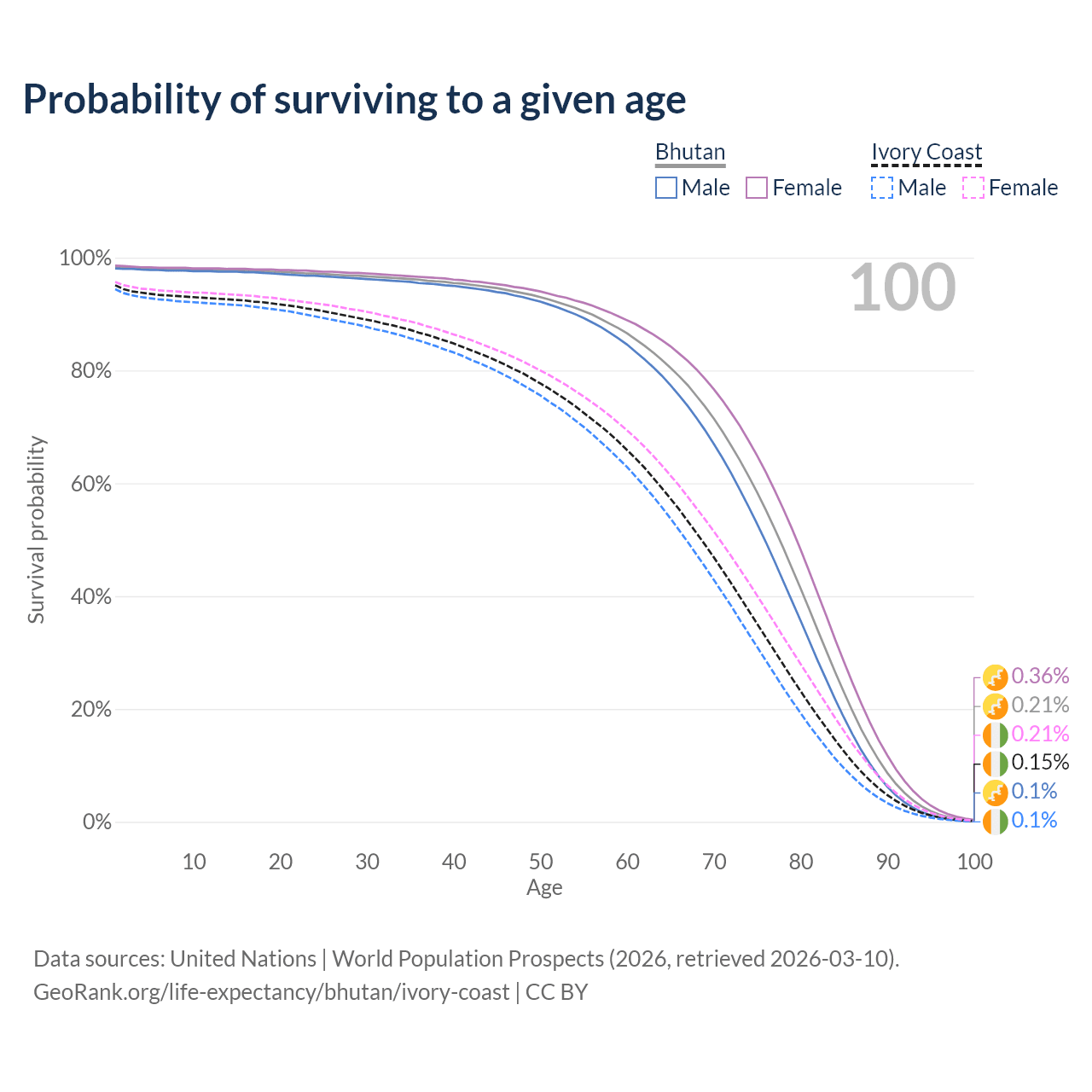 This life expectancy calculator shows the odds of living to 100, 95, 90, and below based on current age for both males and females in Bhutan and Ivory Coast, along with mean and median age of death. The calculations are based on the 2026 life tables (actuarial tables) from the UN World Population Prospects.