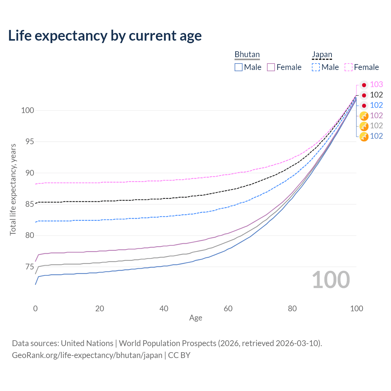 This life expectancy calculator shows the odds of living to 100, 95, 90, and below based on current age for both males and females in Bhutan and Japan, along with mean and median age of death. The calculations are based on the 2026 life tables (actuarial tables) from the UN World Population Prospects.