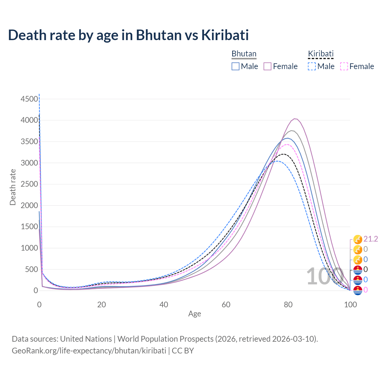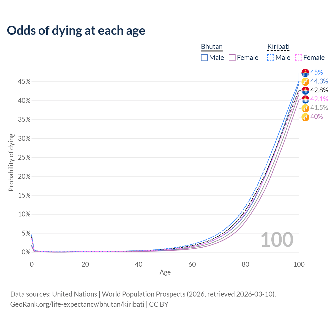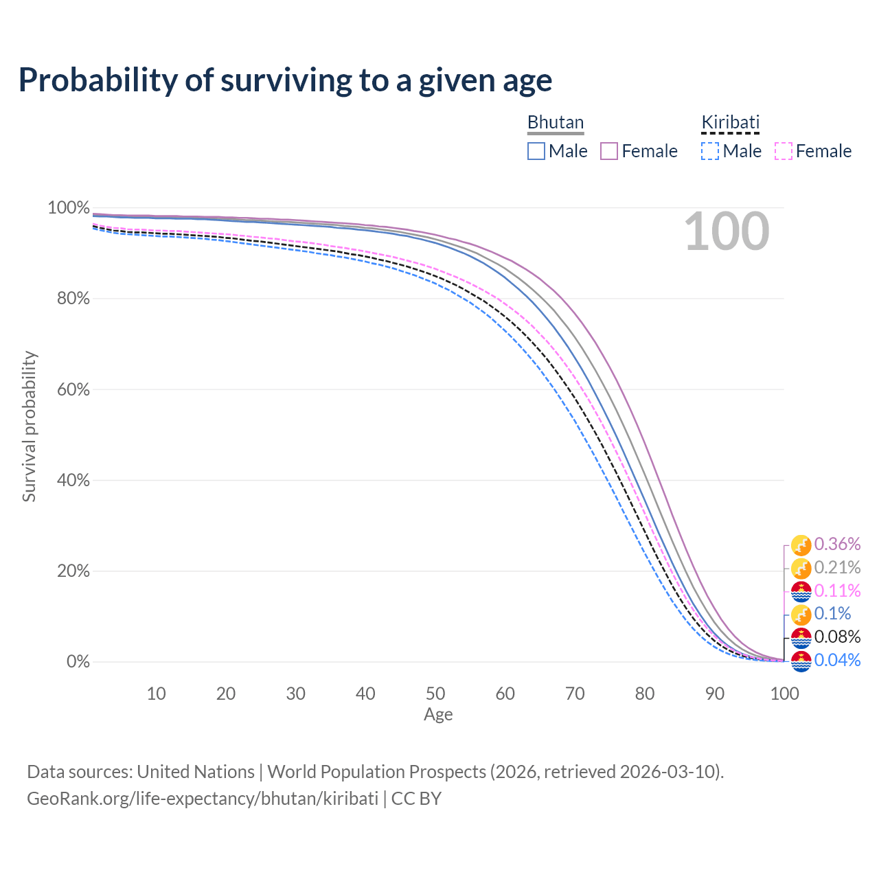 This life expectancy calculator shows the odds of living to 100, 95, 90, and below based on current age for both males and females in Bhutan and Kiribati, along with mean and median age of death. The calculations are based on the 2026 life tables (actuarial tables) from the UN World Population Prospects.
