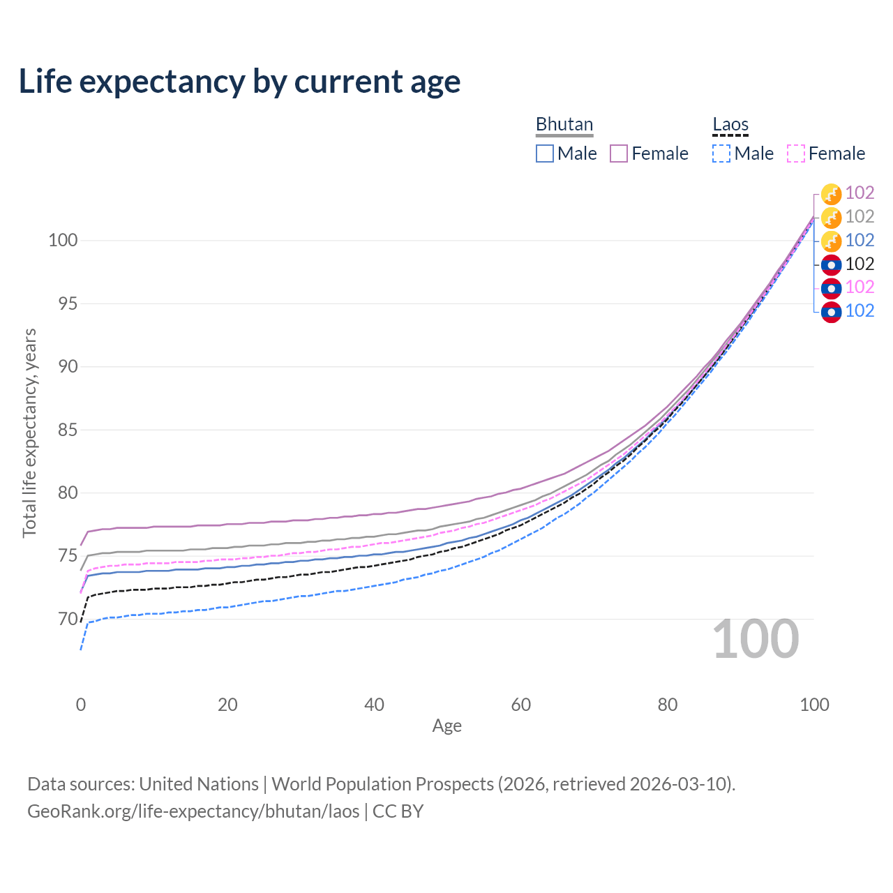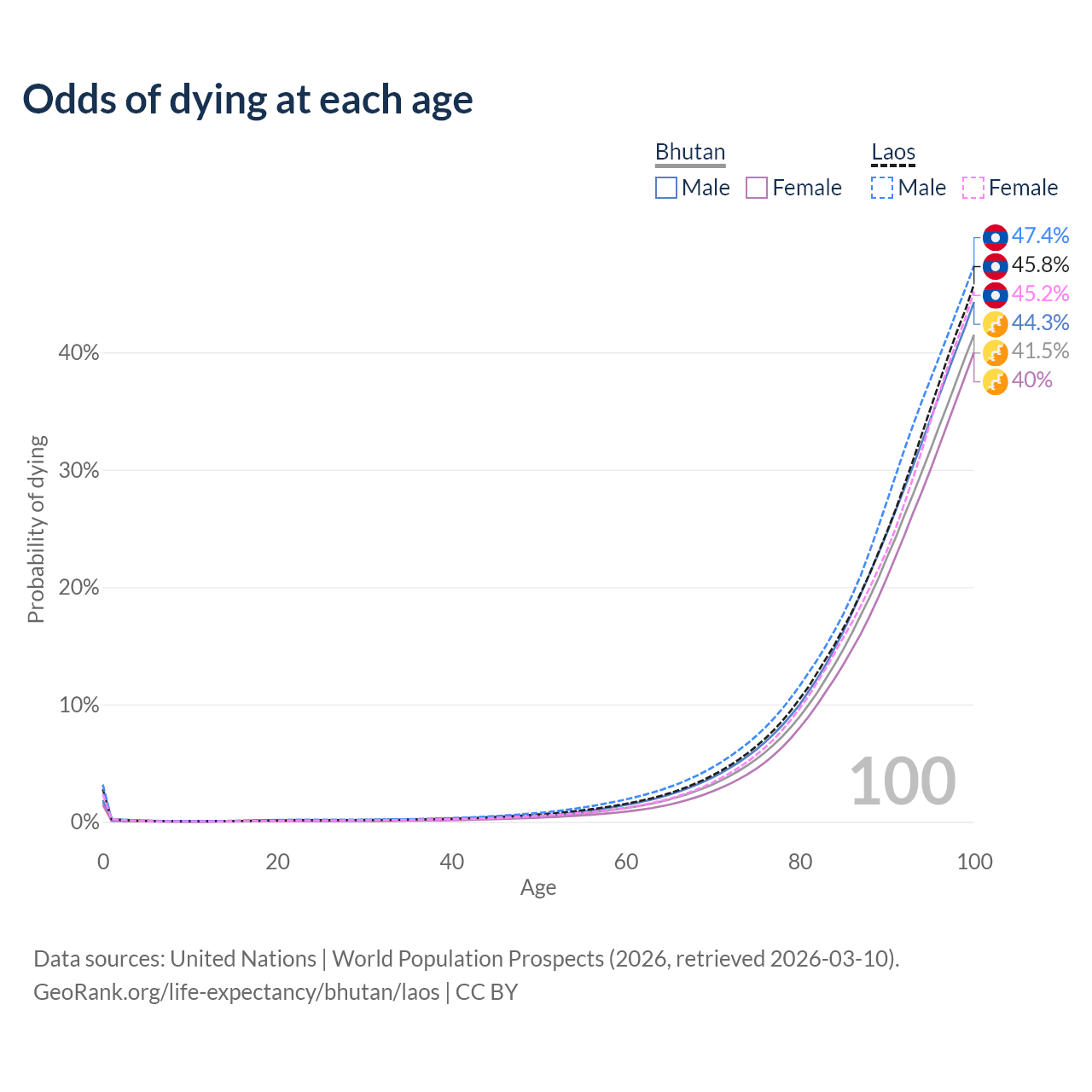 This life expectancy calculator shows the odds of living to 100, 95, 90, and below based on current age for both males and females in Bhutan and Laos, along with mean and median age of death. The calculations are based on the 2026 life tables (actuarial tables) from the UN World Population Prospects.