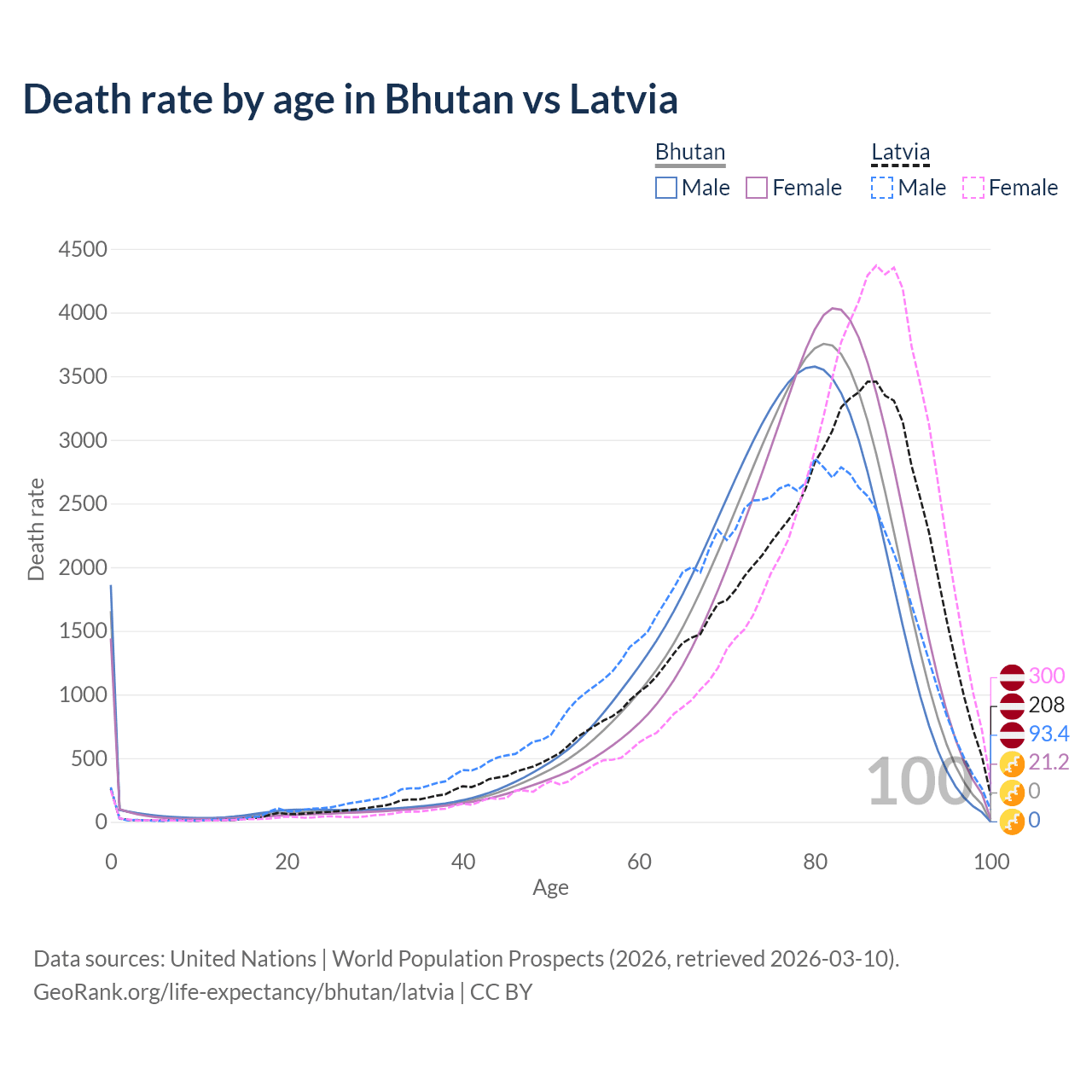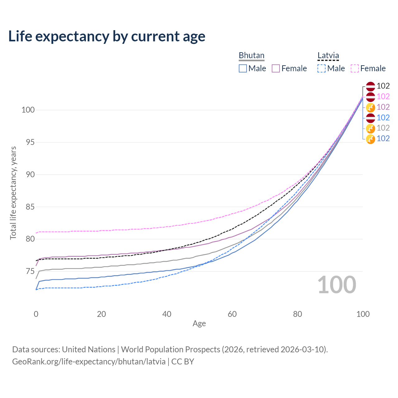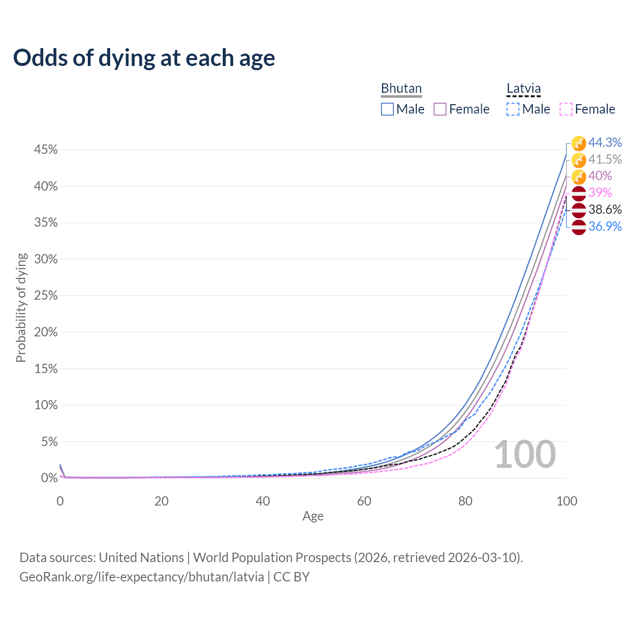 This life expectancy calculator shows the odds of living to 100, 95, 90, and below based on current age for both males and females in Bhutan and Latvia, along with mean and median age of death. The calculations are based on the 2026 life tables (actuarial tables) from the UN World Population Prospects.