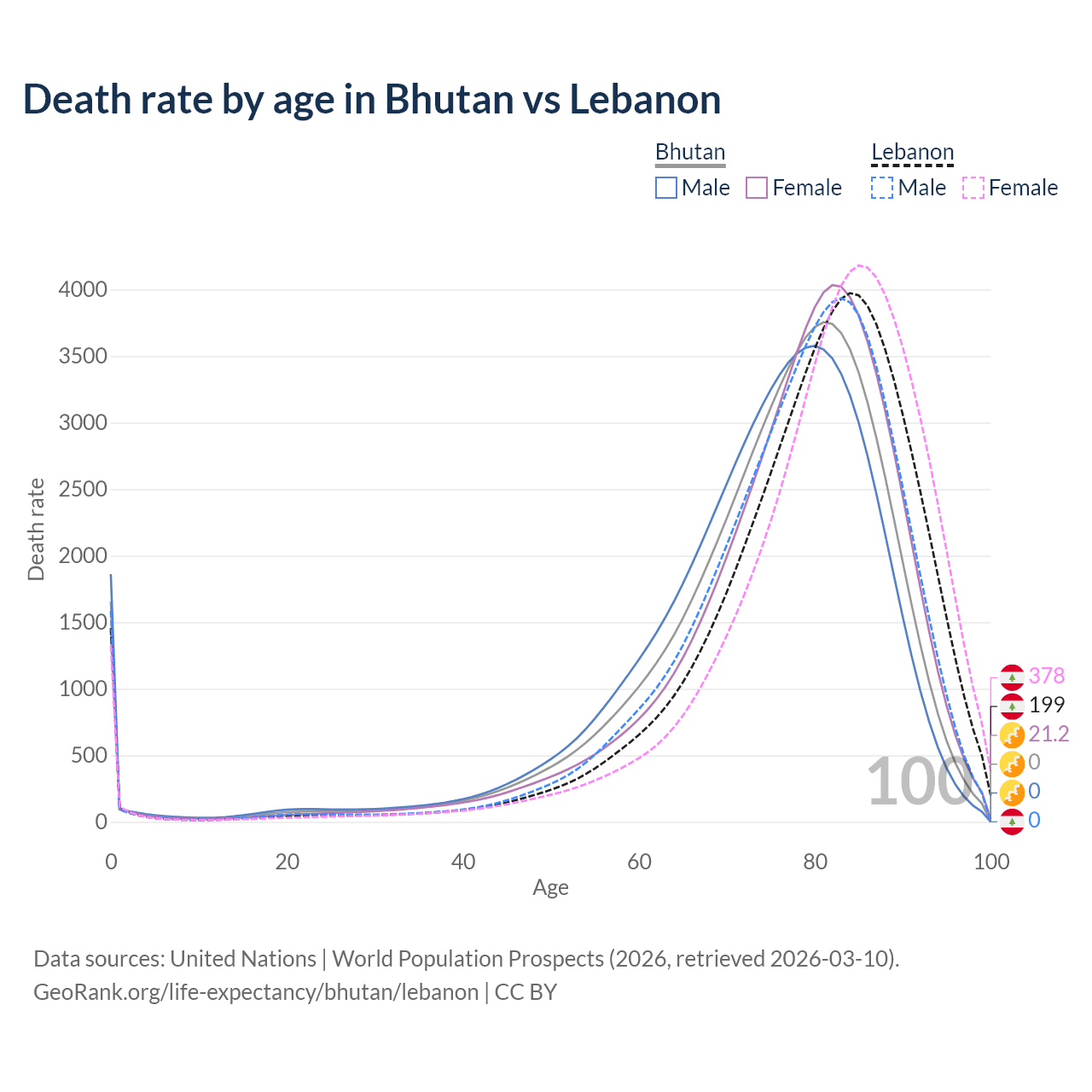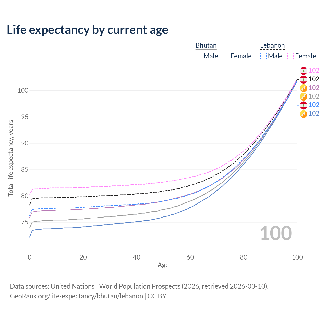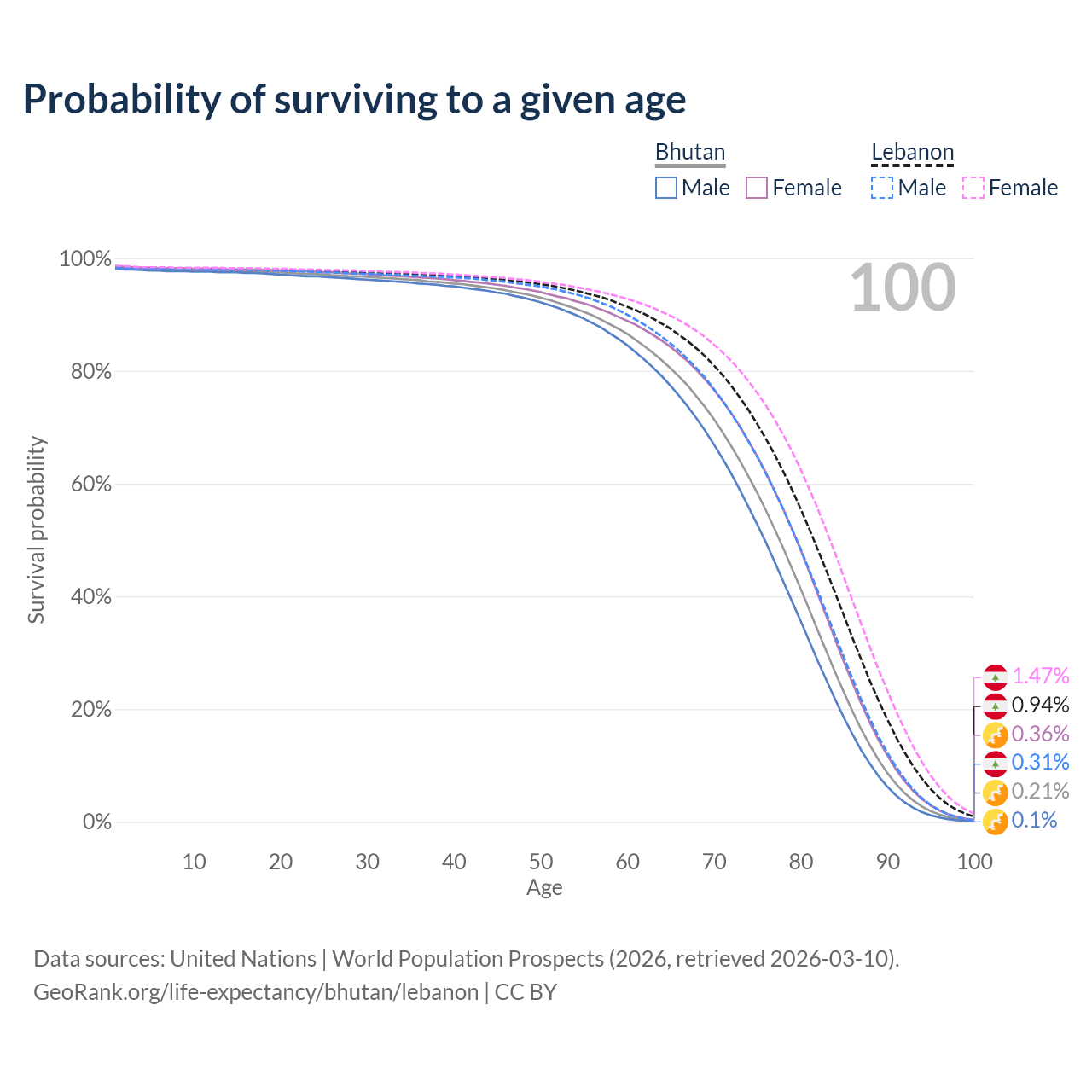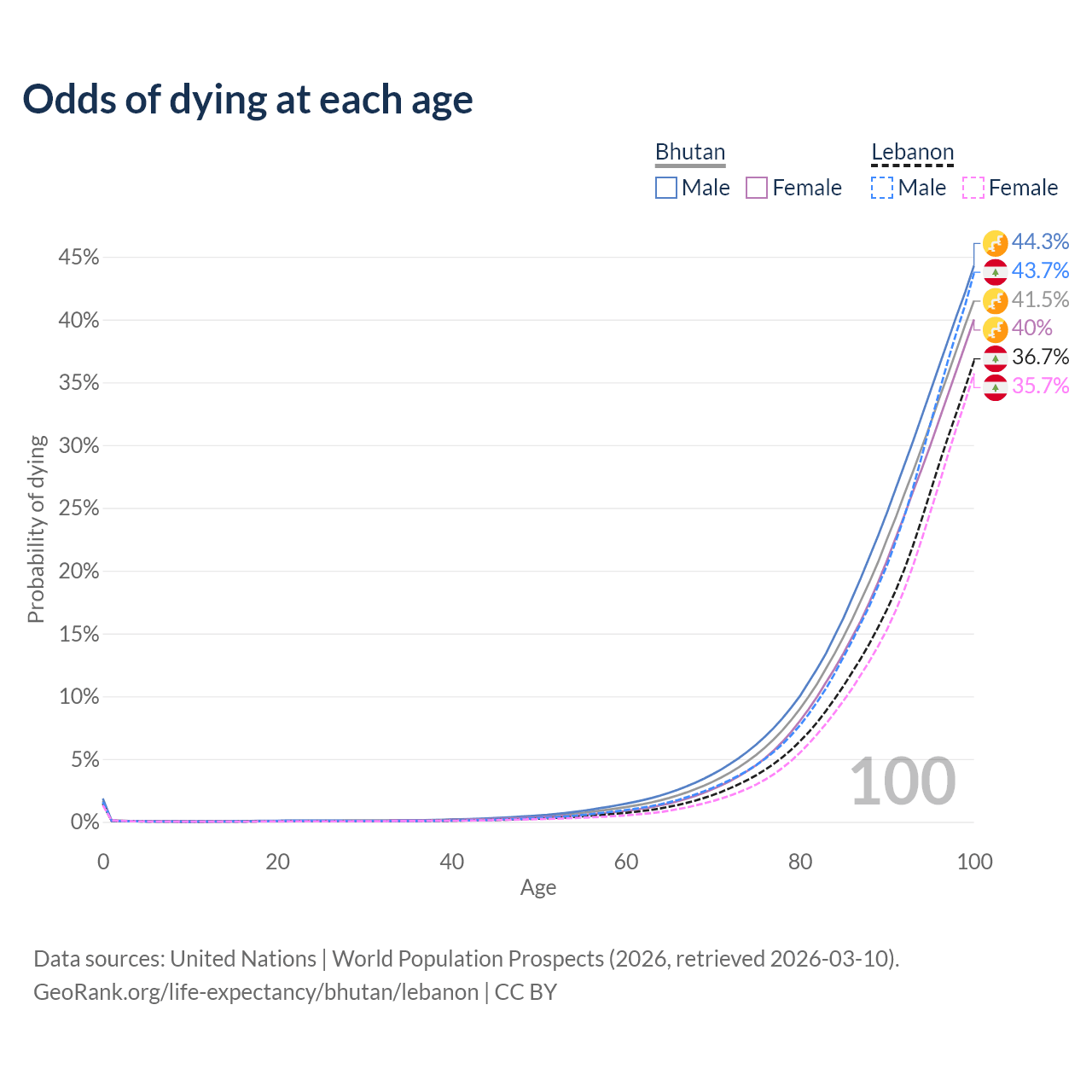 This life expectancy calculator shows the odds of living to 100, 95, 90, and below based on current age for both males and females in Bhutan and Lebanon, along with mean and median age of death. The calculations are based on the 2026 life tables (actuarial tables) from the UN World Population Prospects.