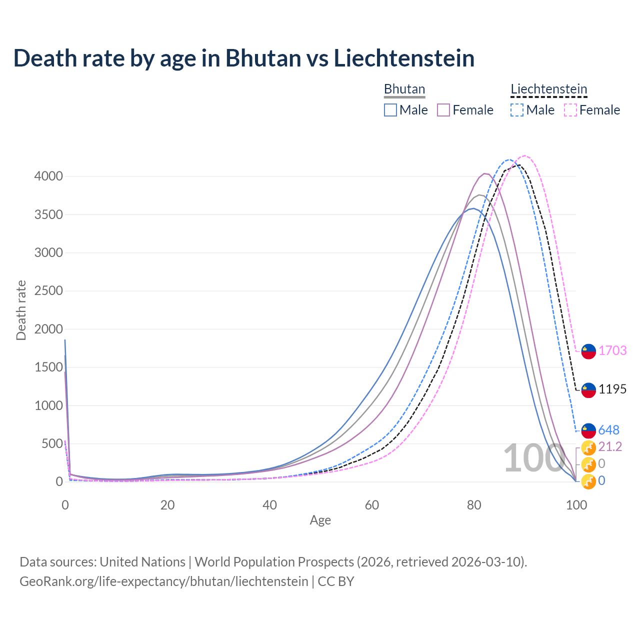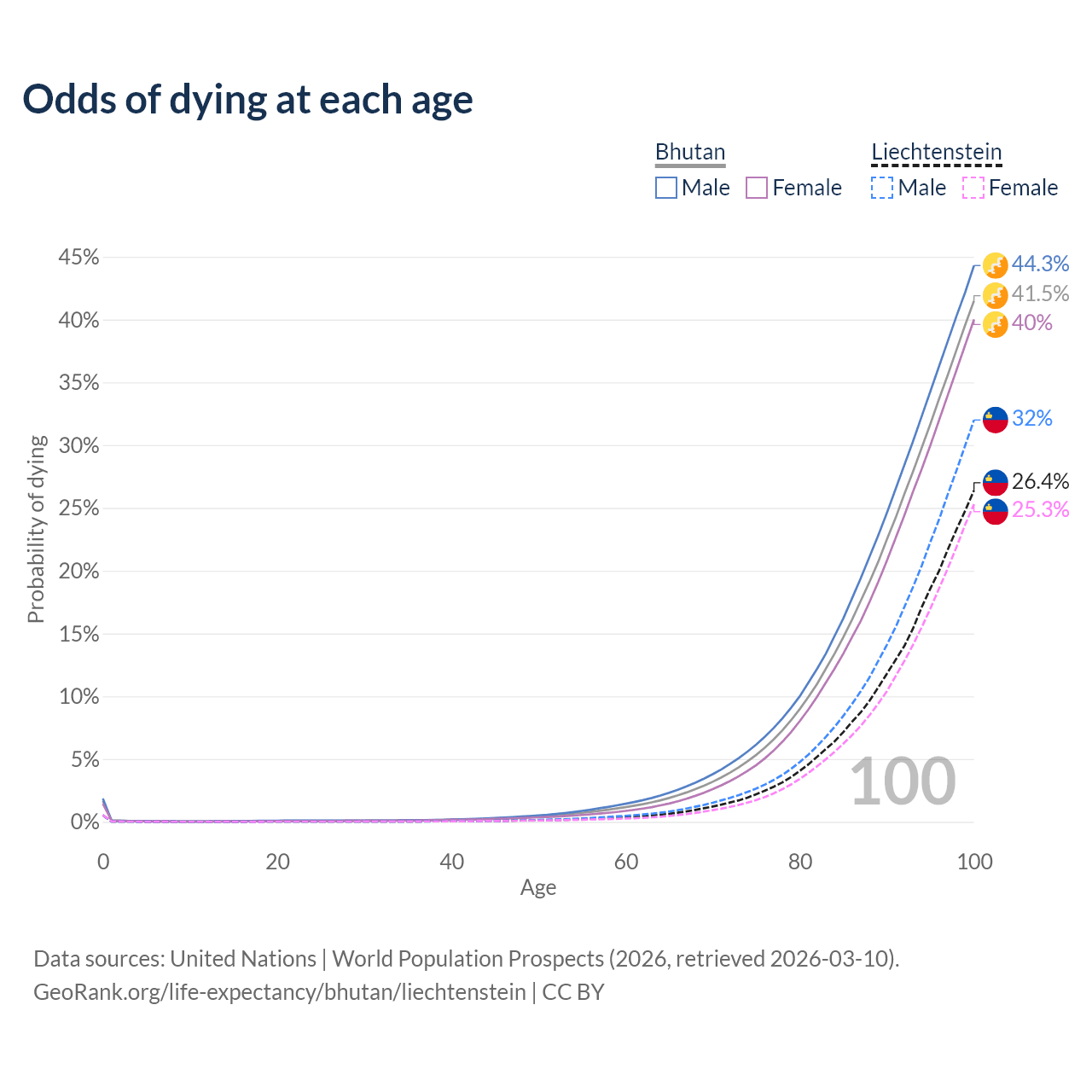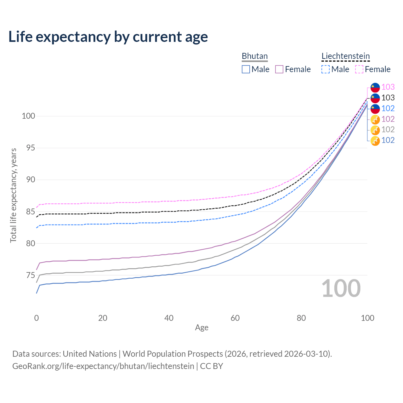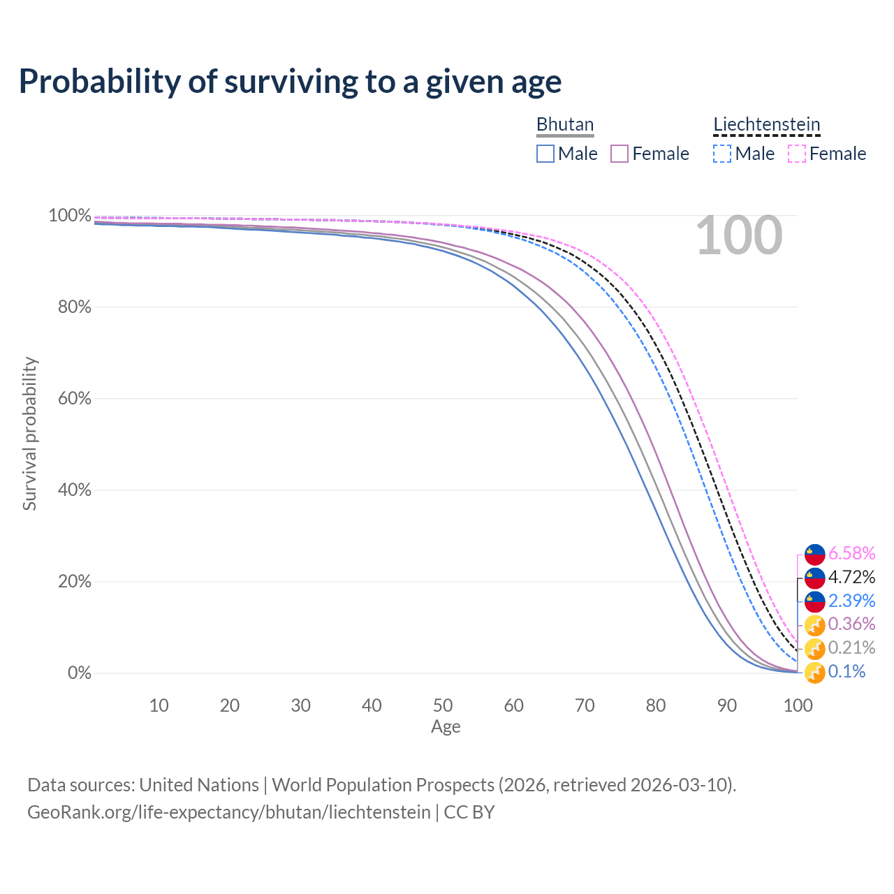 This life expectancy calculator shows the odds of living to 100, 95, 90, and below based on current age for both males and females in Bhutan and Liechtenstein, along with mean and median age of death. The calculations are based on the 2026 life tables (actuarial tables) from the UN World Population Prospects.