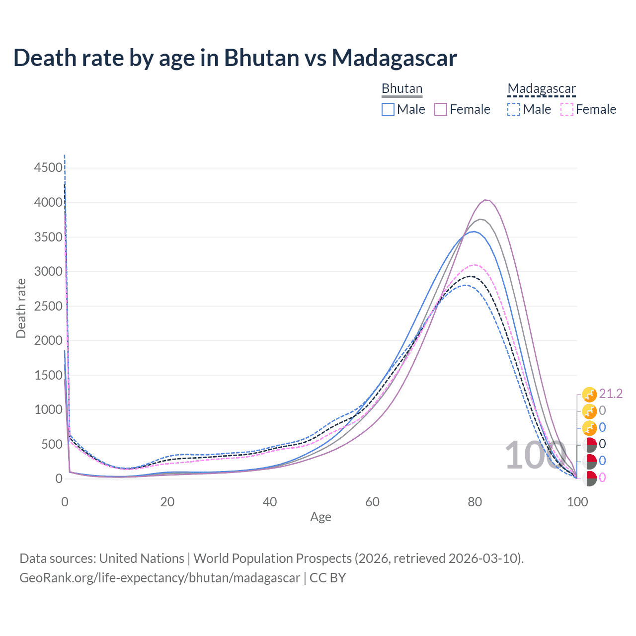 This life expectancy calculator shows the odds of living to 100, 95, 90, and below based on current age for both males and females in Bhutan and Madagascar, along with mean and median age of death. The calculations are based on the 2026 life tables (actuarial tables) from the UN World Population Prospects.
