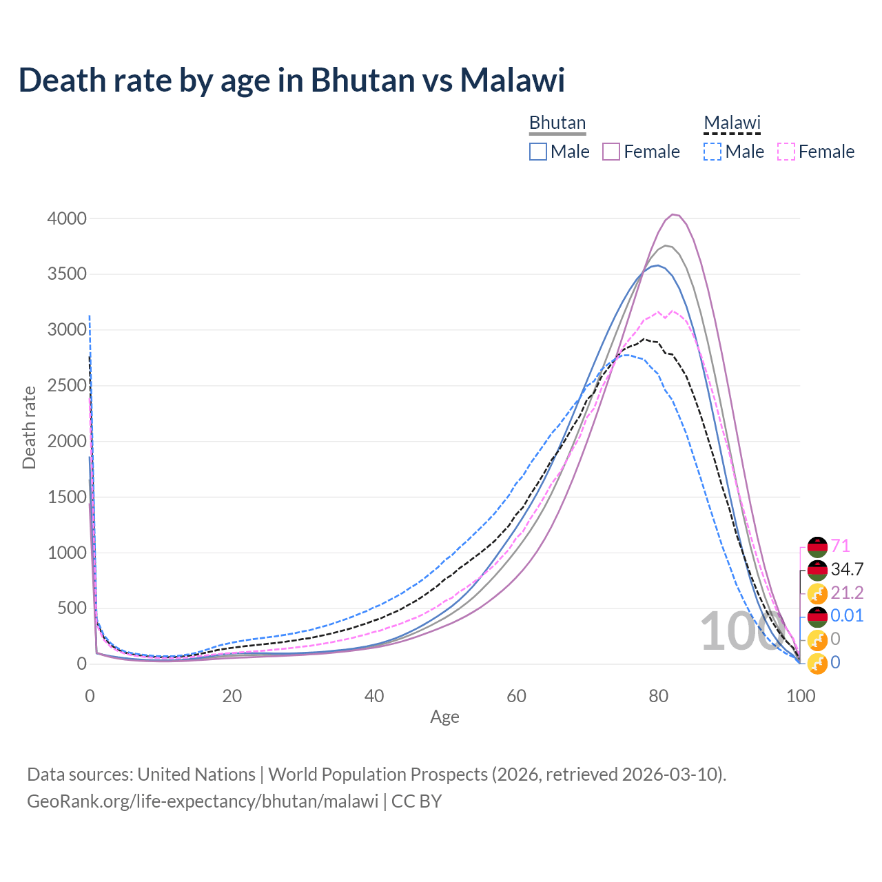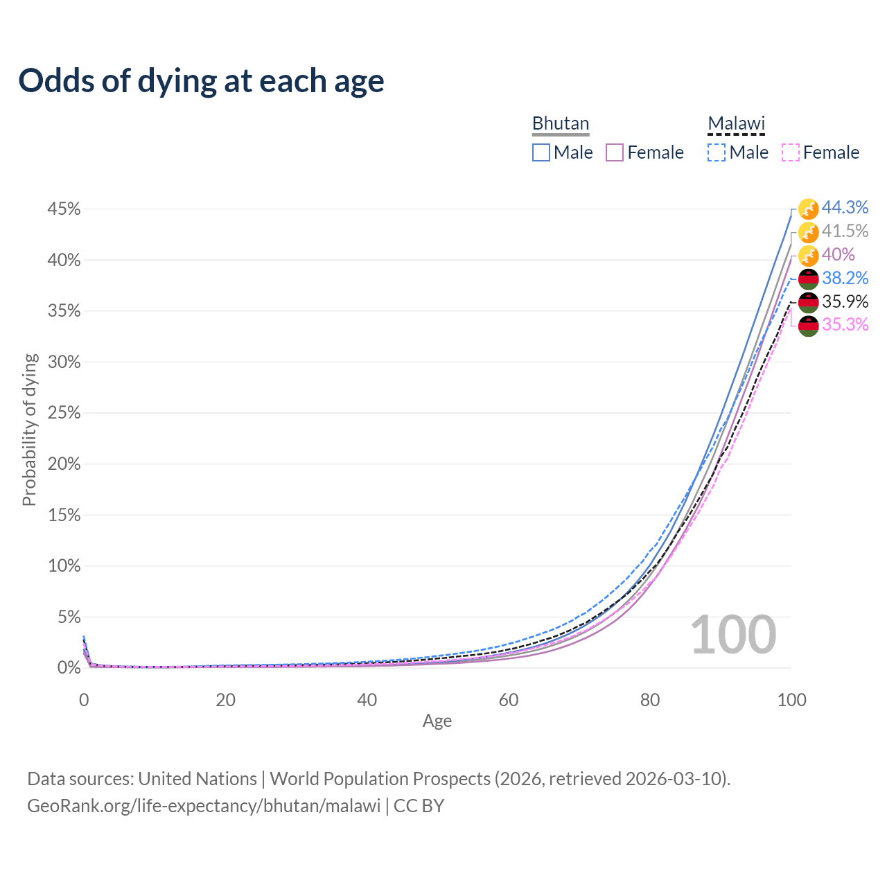 This life expectancy calculator shows the odds of living to 100, 95, 90, and below based on current age for both males and females in Bhutan and Malawi, along with mean and median age of death. The calculations are based on the 2026 life tables (actuarial tables) from the UN World Population Prospects.
