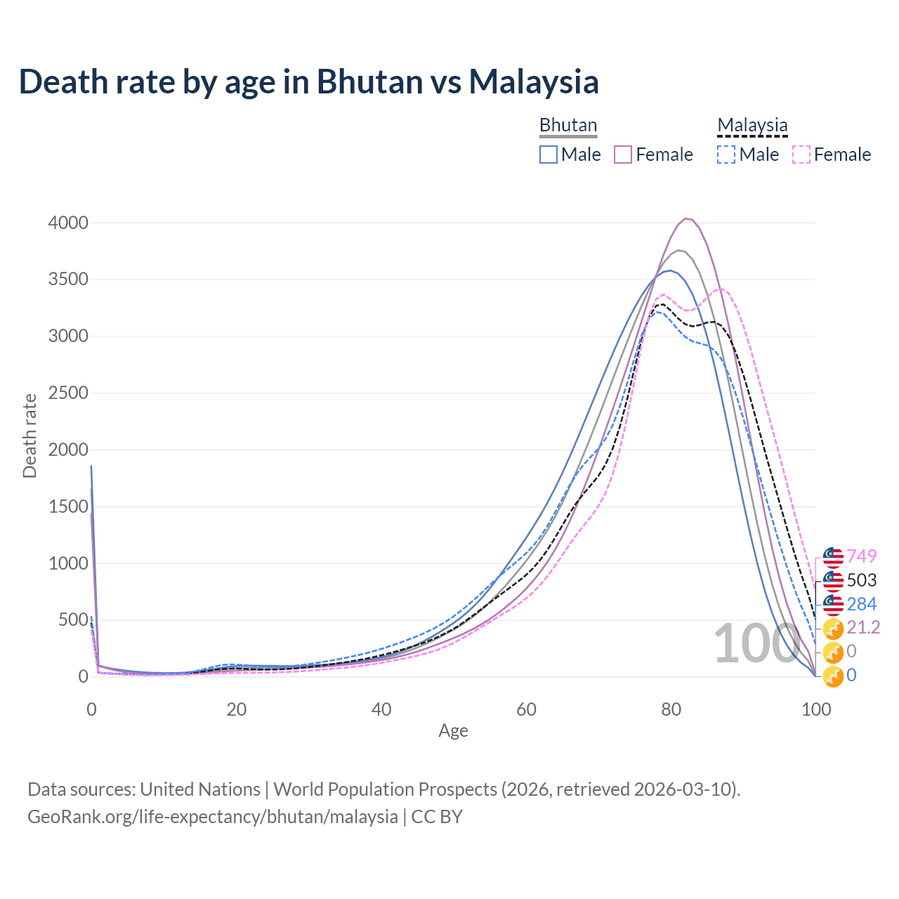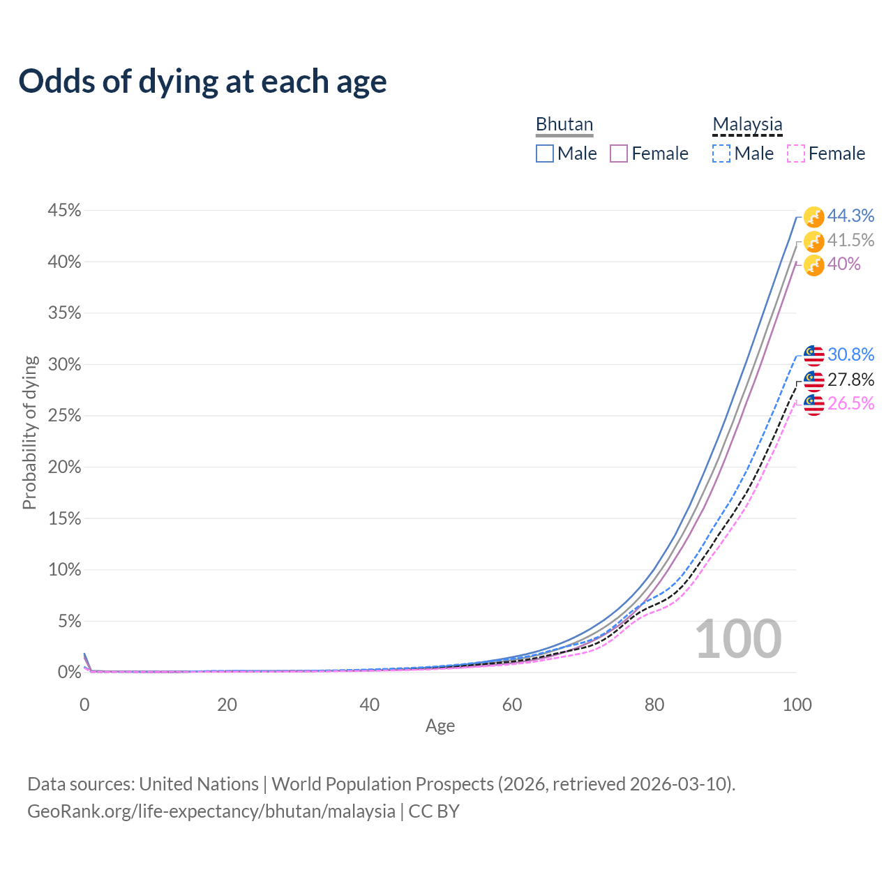 This life expectancy calculator shows the odds of living to 100, 95, 90, and below based on current age for both males and females in Bhutan and Malaysia, along with mean and median age of death. The calculations are based on the 2026 life tables (actuarial tables) from the UN World Population Prospects.