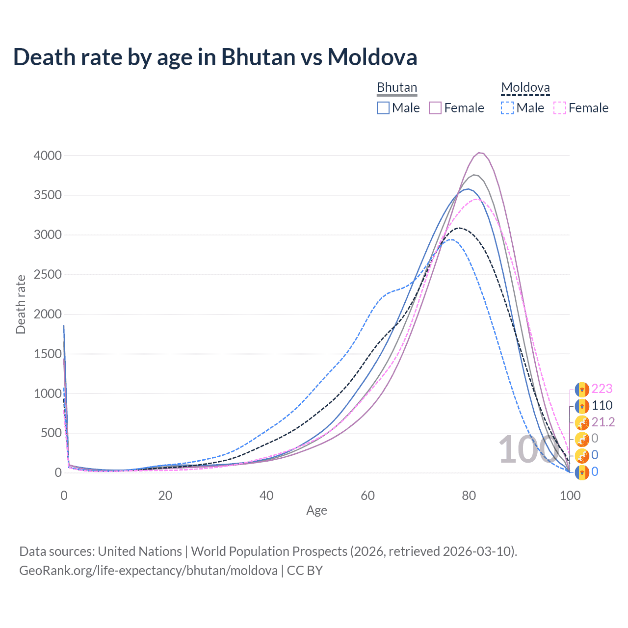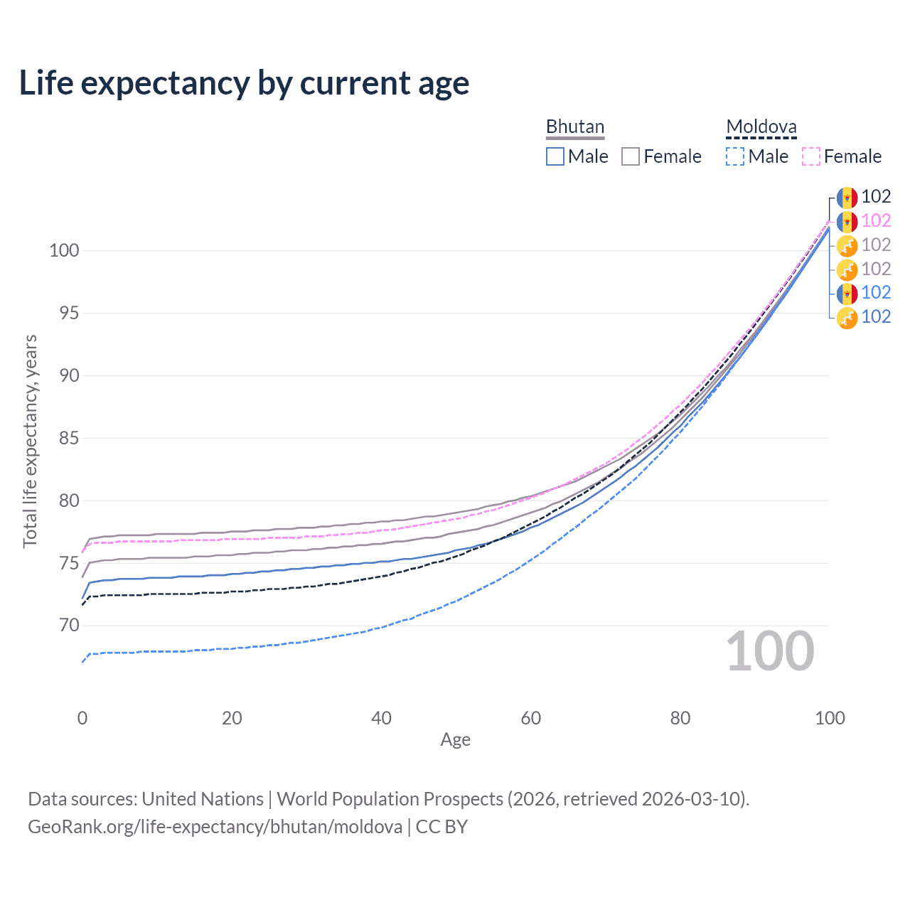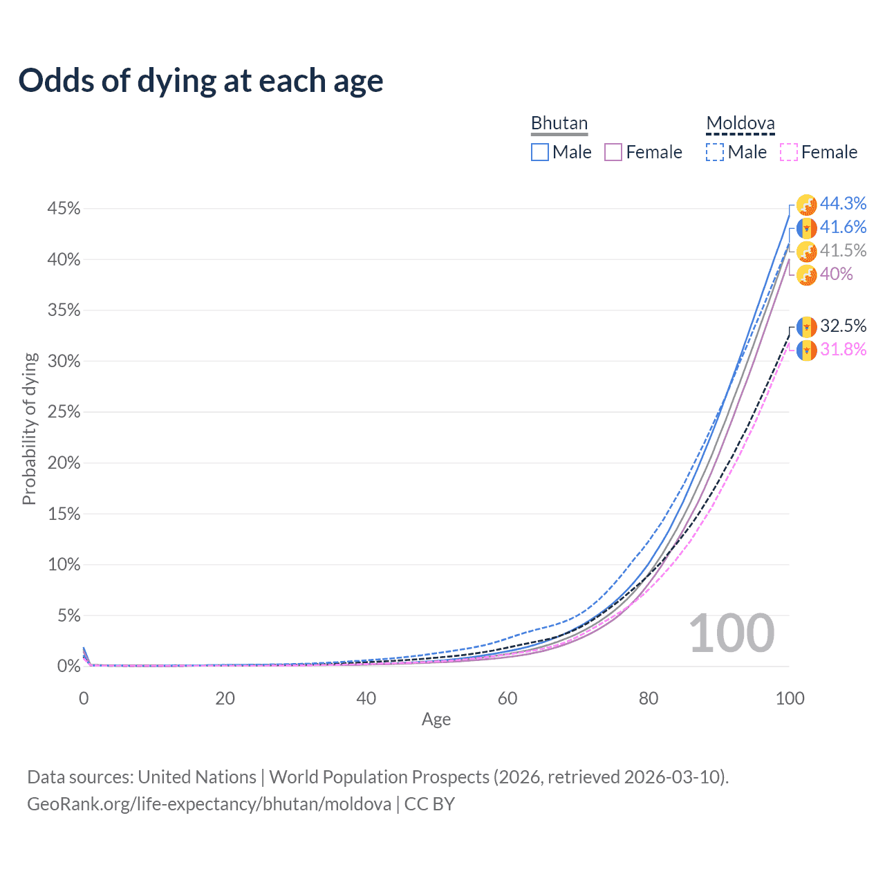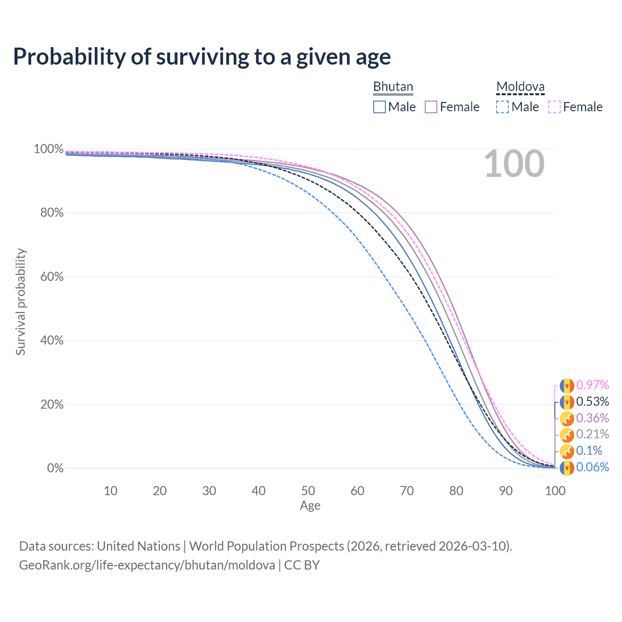 This life expectancy calculator shows the odds of living to 100, 95, 90, and below based on current age for both males and females in Bhutan and Moldova, along with mean and median age of death. The calculations are based on the 2026 life tables (actuarial tables) from the UN World Population Prospects.