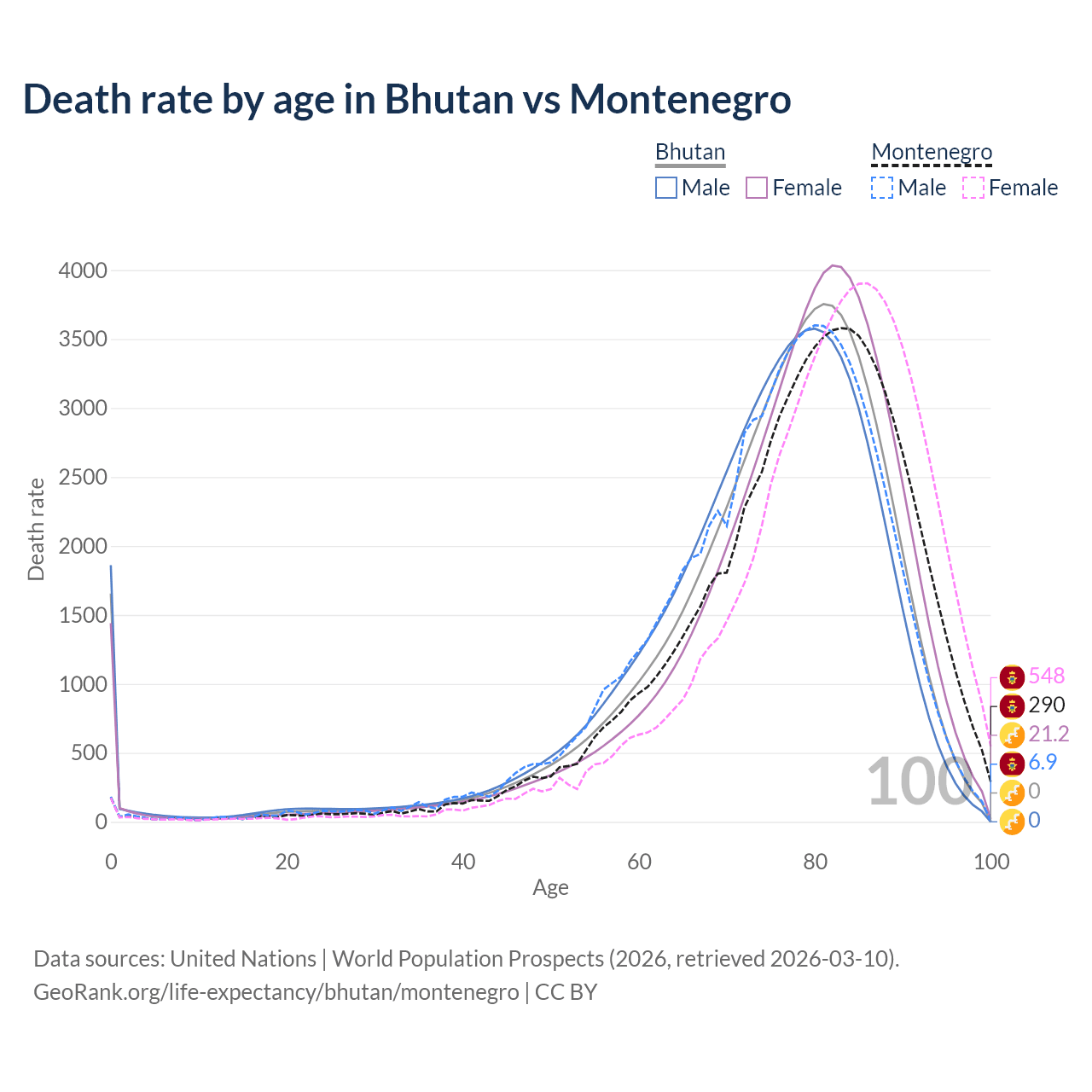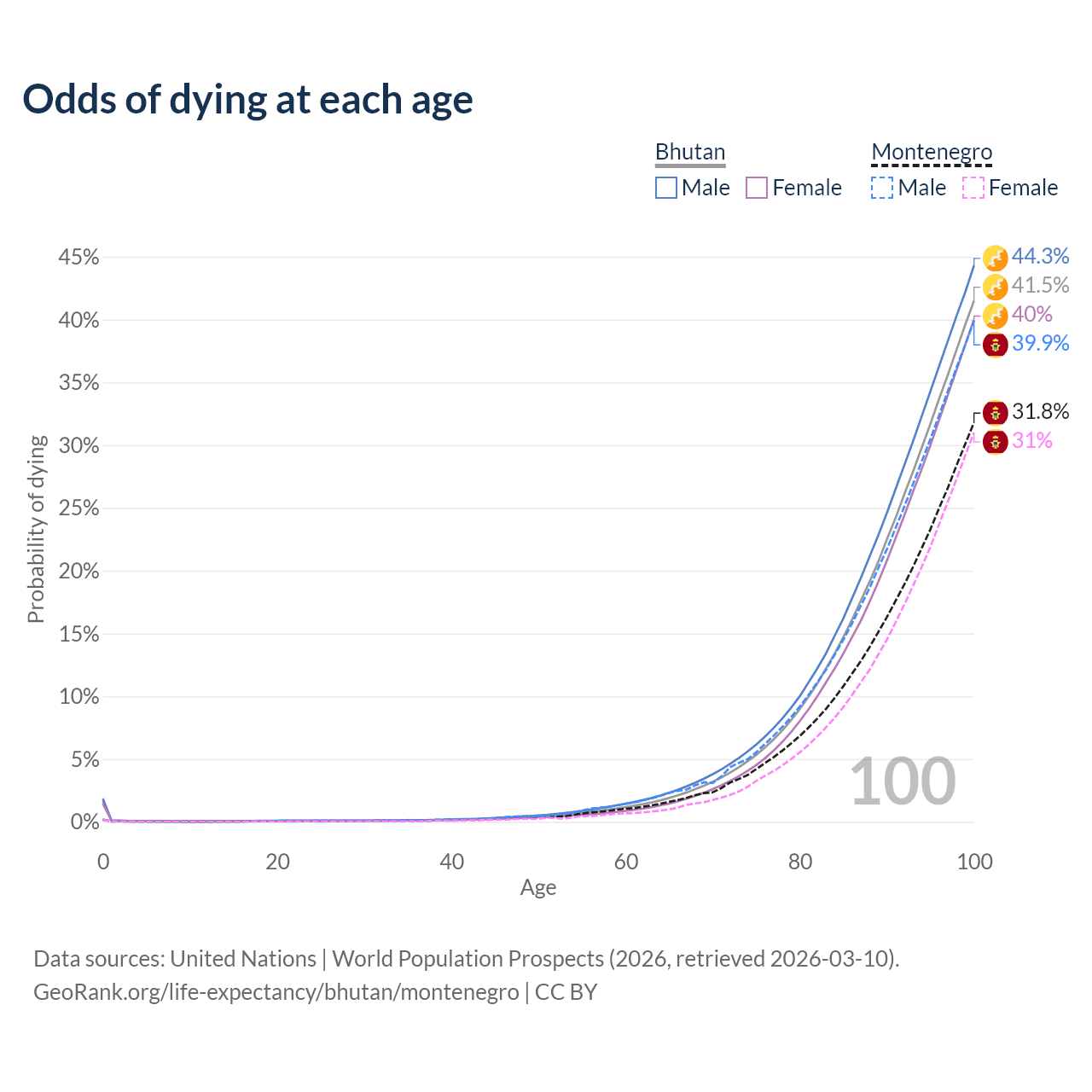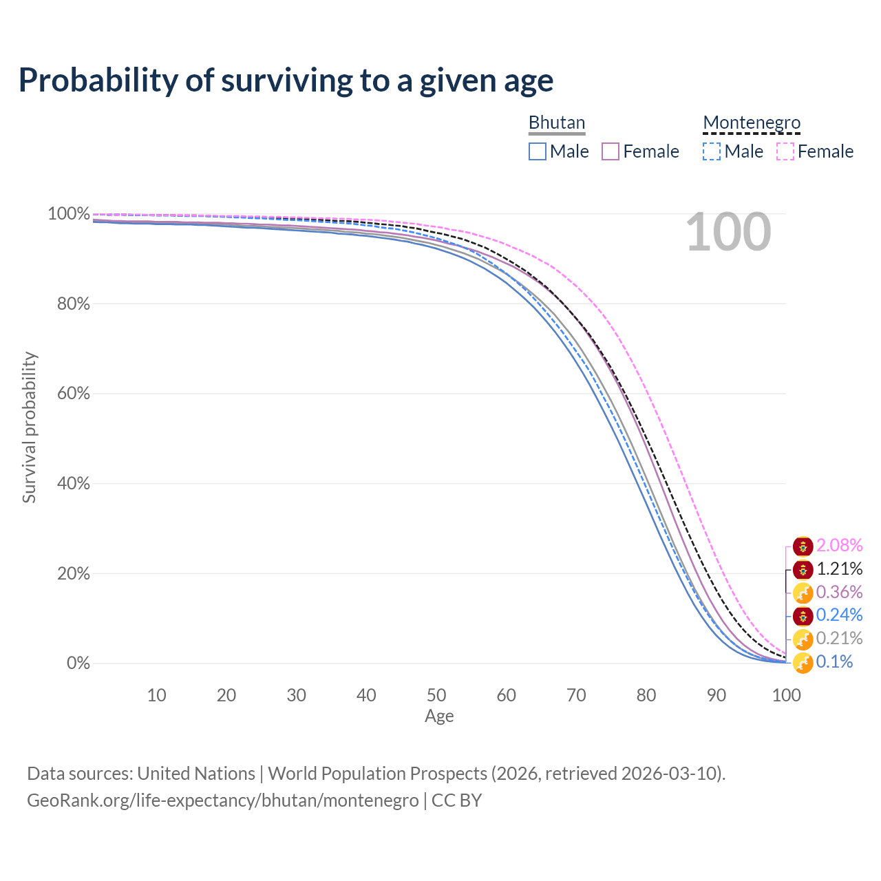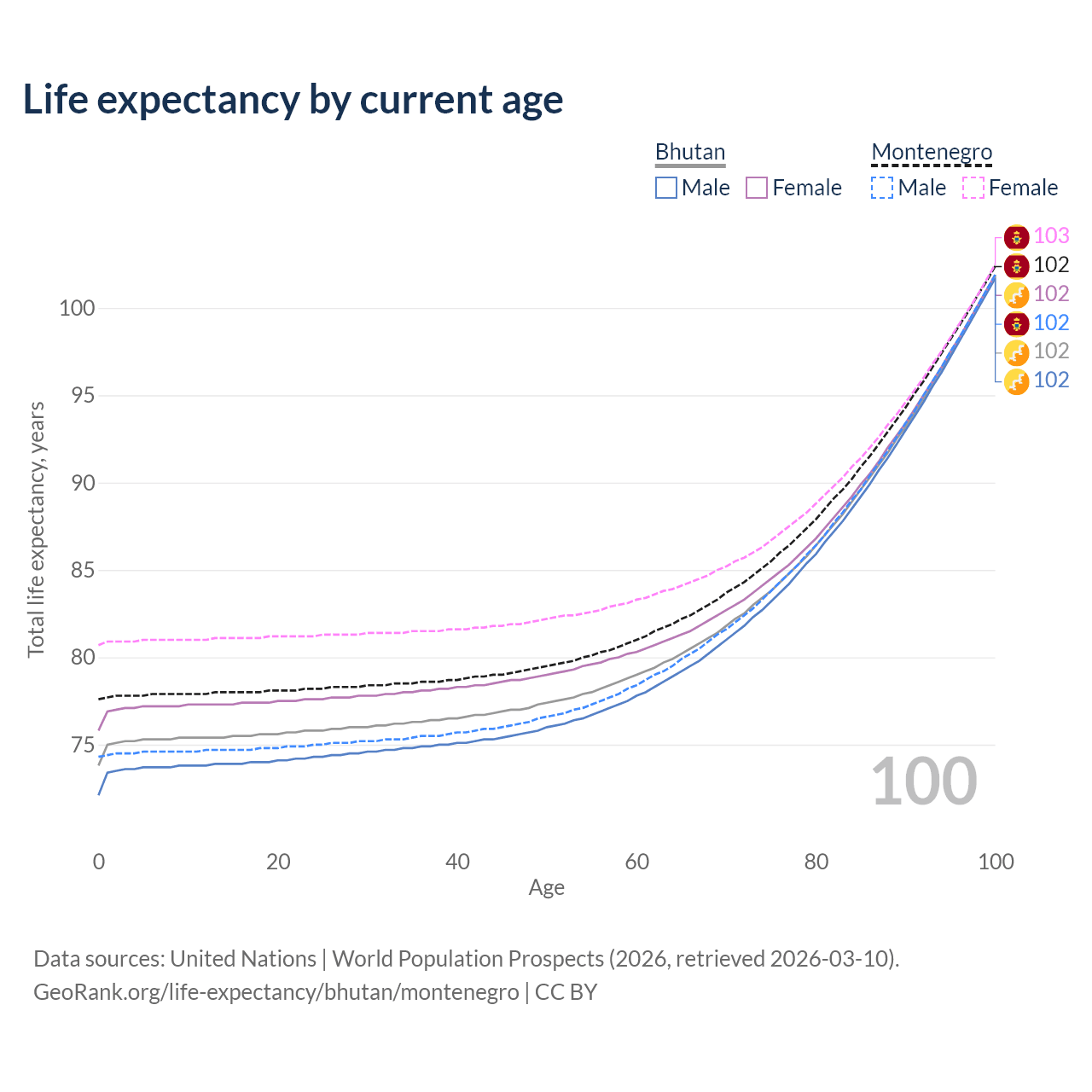 This life expectancy calculator shows the odds of living to 100, 95, 90, and below based on current age for both males and females in Bhutan and Montenegro, along with mean and median age of death. The calculations are based on the 2026 life tables (actuarial tables) from the UN World Population Prospects.