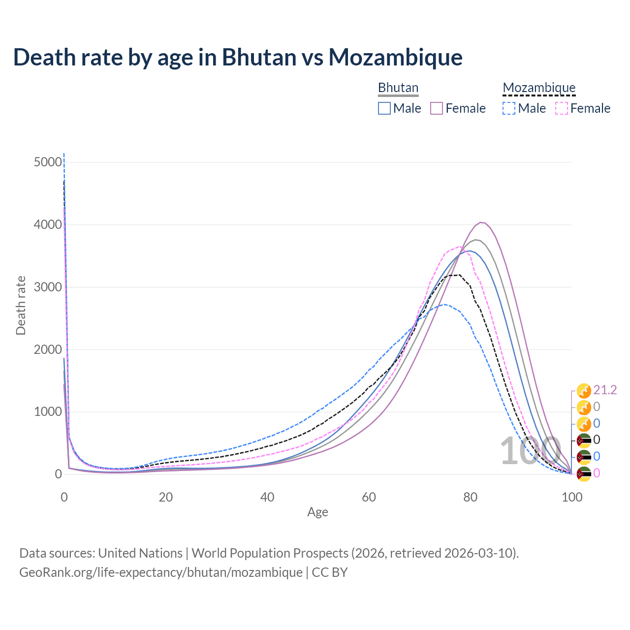 In Bhutan, the most common age of death is 81, compared to 0 in Mozambique. The median age of death is 77.6 in Bhutan and 71.2 in Mozambique, meaning only half of each cohort is expected to live past that age.