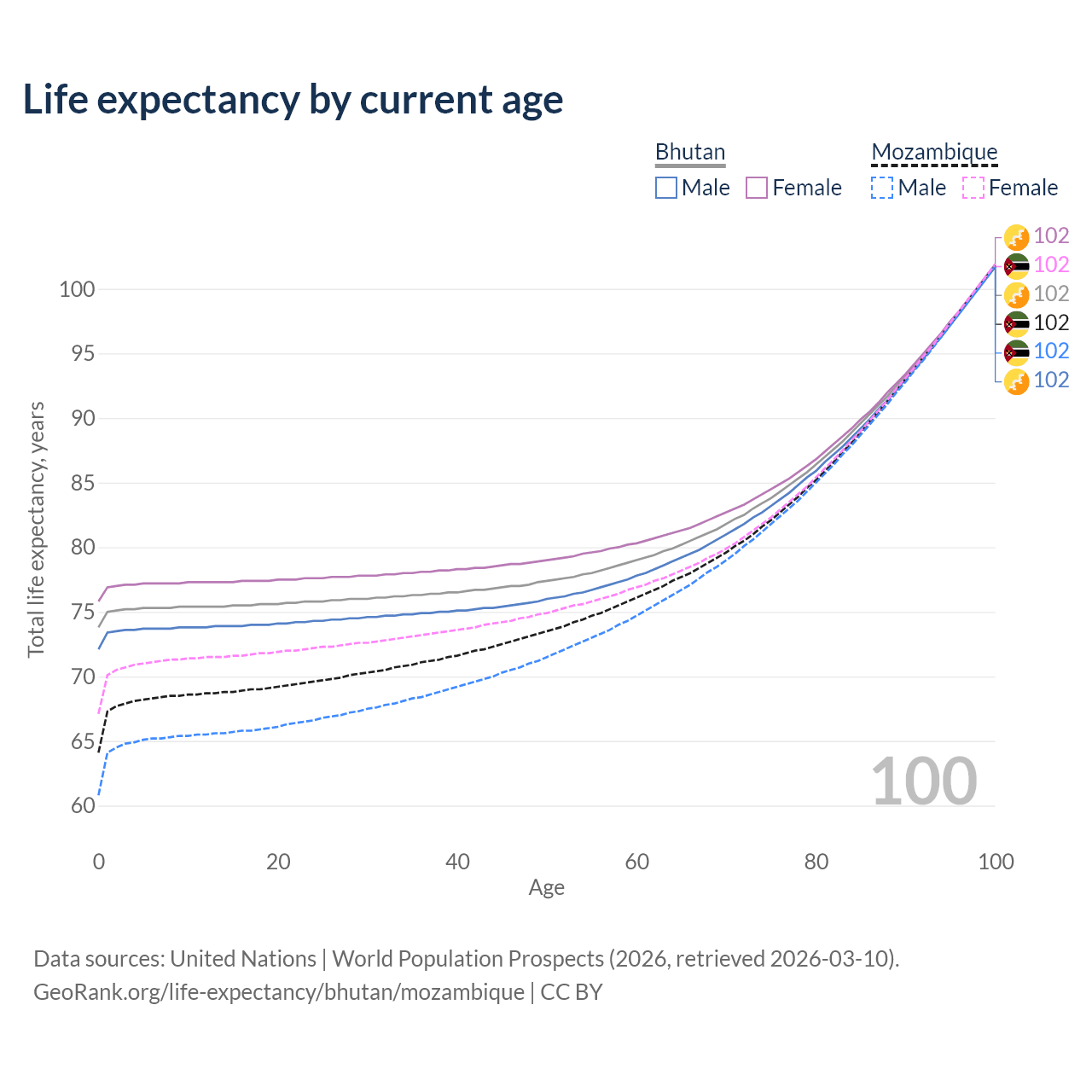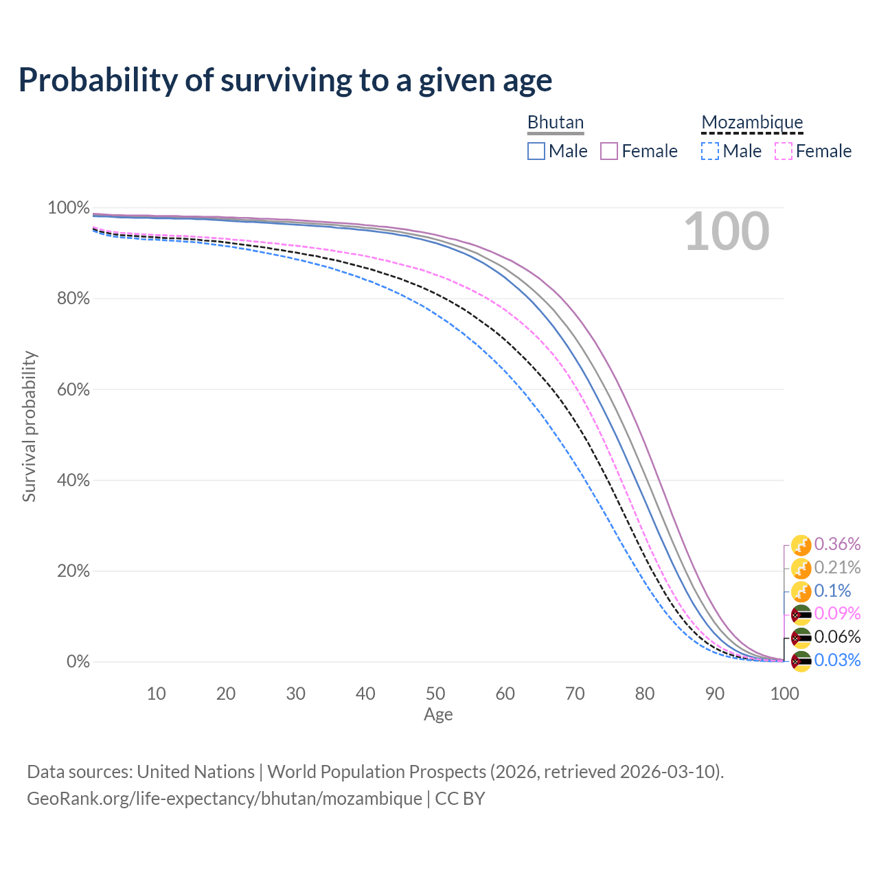 This life expectancy calculator shows the odds of living to 100, 95, 90, and below based on current age for both males and females in Bhutan and Mozambique, along with mean and median age of death. The calculations are based on the 2026 life tables (actuarial tables) from the UN World Population Prospects.