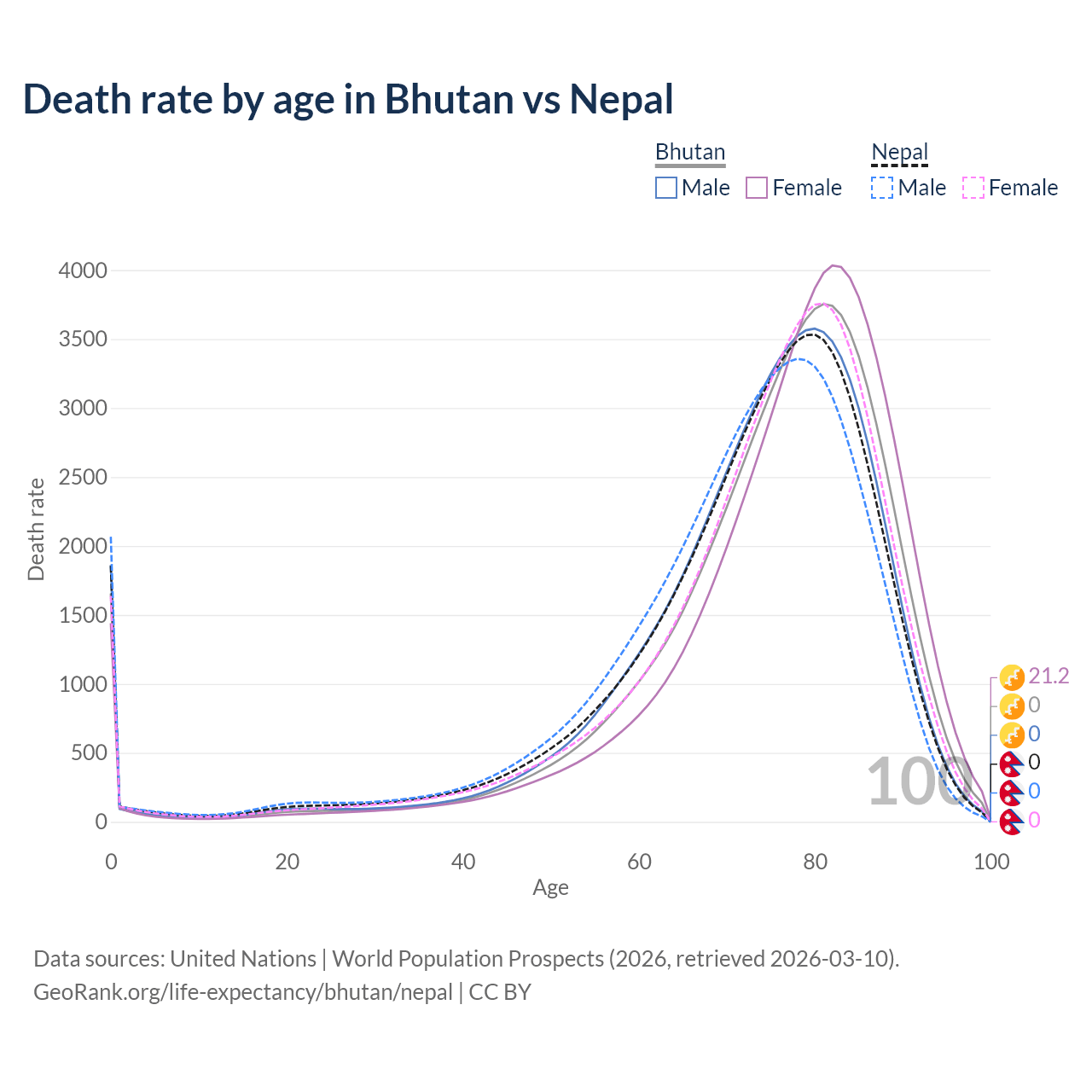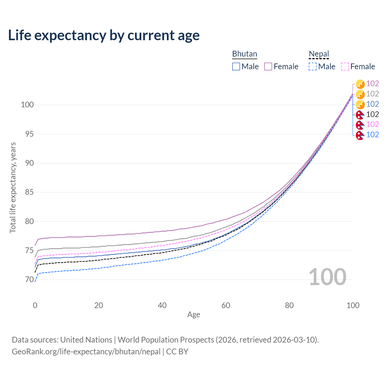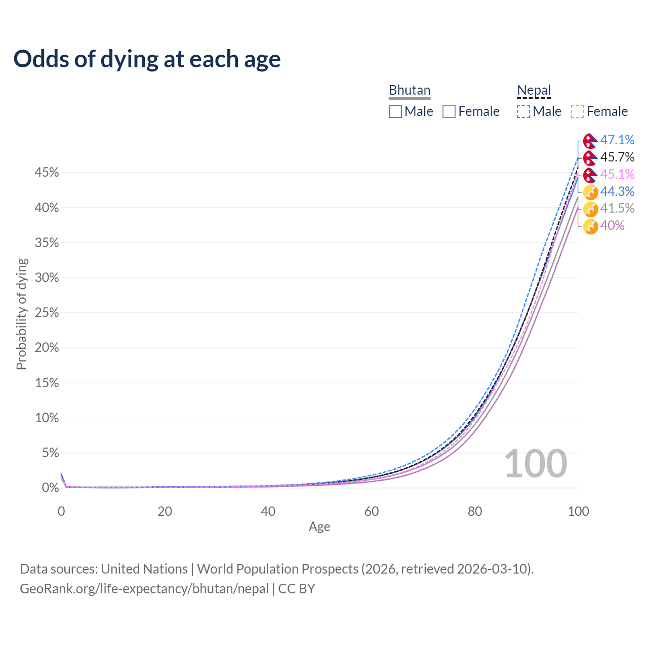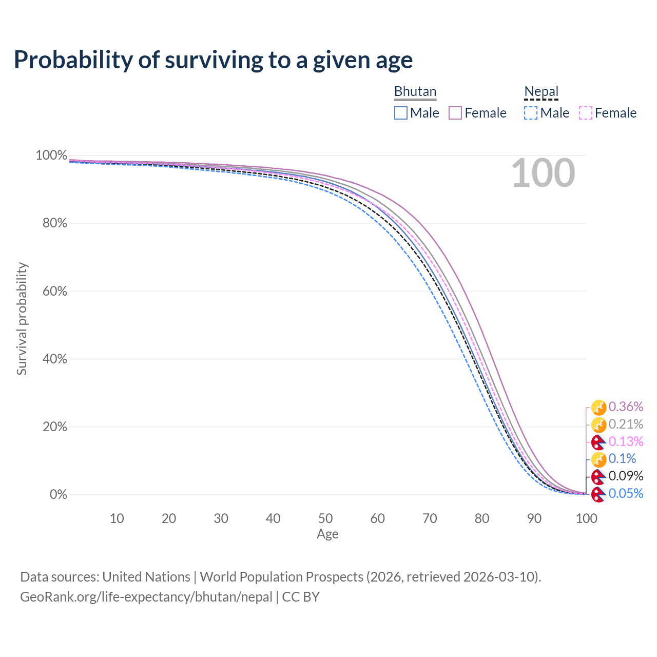 This life expectancy calculator shows the odds of living to 100, 95, 90, and below based on current age for both males and females in Bhutan and Nepal, along with mean and median age of death. The calculations are based on the 2026 life tables (actuarial tables) from the UN World Population Prospects.